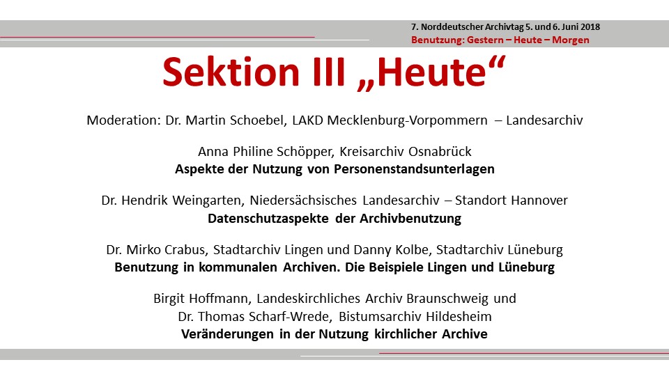 Nachdem sich die Archive vom 19. Jahrhundert sukzessive gegenüber den Bürgern geöffnet hatten, gehört die Benutzung heute zu den klassischen Kernaufgaben der Archive. Dazu gehören neben der Erschließung und Bereitstellung von Archivalien die Benutzerberatung und auch die Akquise, die Gewinnung neuer Benutzerkreise durch gezielte Öffentlichkeitsarbeit. Archivbenutzung heute, dies bedeutet auch ein Reagieren auf die spezifischen Nutzerinteressen in Archiven unterschiedlicher Größe und Sparte. Berichte aus kommunalen und staatlichen Archiven in der Sektion „Heute“ verdeutlichten diese unterschiedlichen Anforderungen. Dem gegenüber bewegen sich alle Archive heute zwischen Anforderungen der Öffentlichkeit einerseits und (datenschutz)rechtlichen Rahmenbedingungen andererseits.