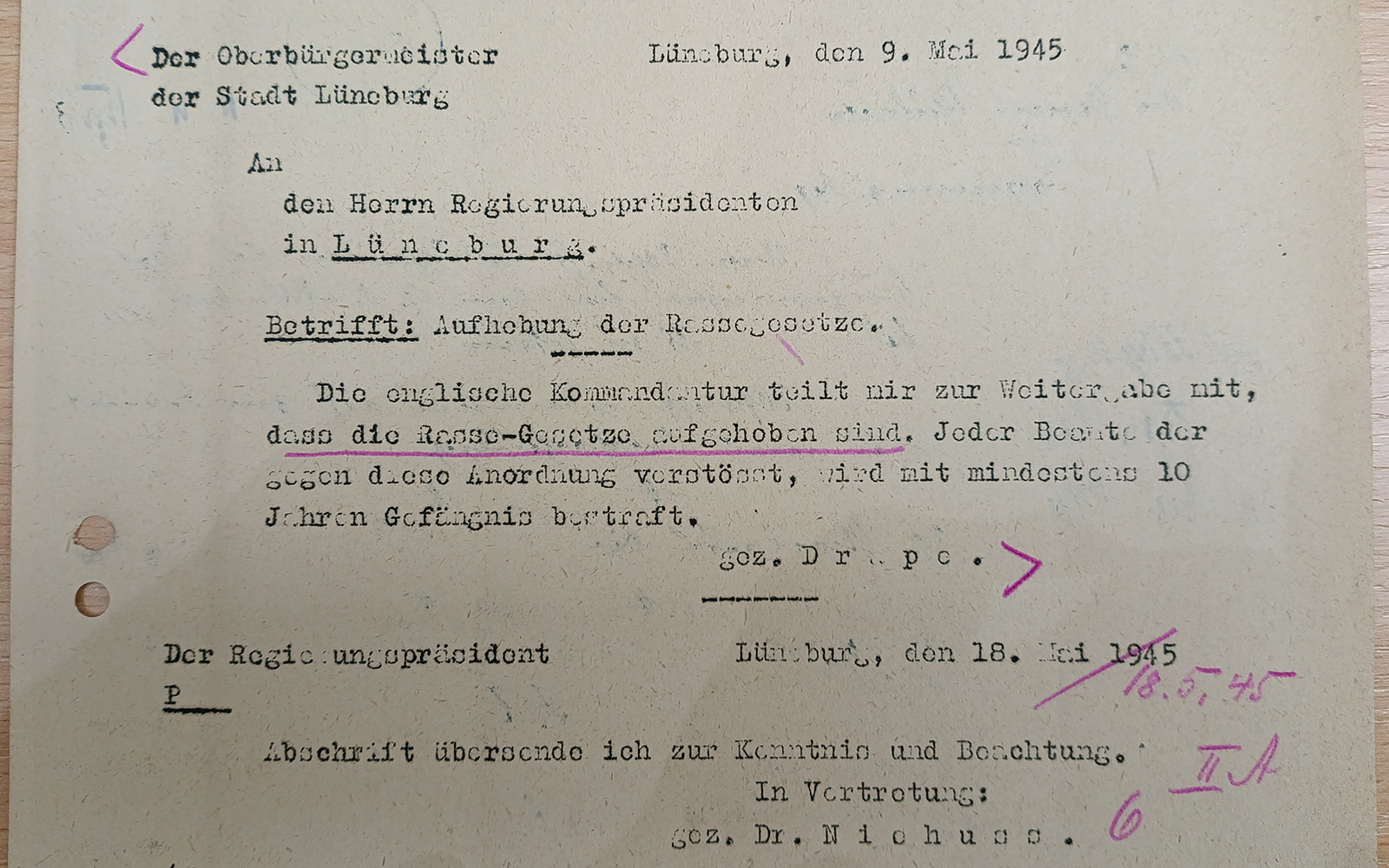 „ Die englische Kommandantur teilt mir zur Weitergabe mit, dass die Rasse-Gesetze aufgehoben sind. Jeder Beamte, der gegen die Anordnung verstösst, wird mit mindestens 10 Jahren Gefängnis bestraft.“
