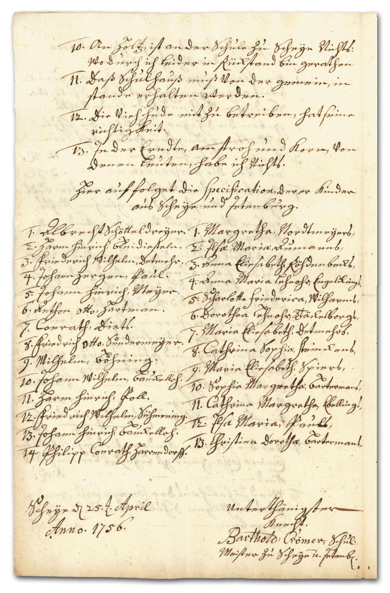 Von jedem Kind erhielt er jährlich 24 Groschen Schulgeld (aus dem benachbarten Jetenburg sogar einen Taler, also die 1½ fache Summe), sowie jährlich 4 Pfennig Opfergeld und 4 Eier zu Ostern („Pascheier“). Zudem gab es für jedes Kind 3 Groschen zum Schulbeginn, 3 Groschen Holzgeld und einen Groschen 4 Pfennig beim Eintritt in ein neues Buch (5 und 6). Die gräfliche Kammerkasse zahlte dem Lehrer für jedes arme Schulkind jährlich einen Taler (8), zudem einen jährlichen Betrag von 4 Talern (9). Das Schulhaus, in dem er auch wohnte, wurde von der Dorfgemeinschaft instand gehalten (11). 54 Haushalte gehörten insgesamt zu seinem Schulbezirk (7), im Jahre 1751 schickten sie 14 Jungen und 13 Mädchen in den Unterricht. Die Schulpflicht bestand grundsätzlich vom sechsten bis zum zwölften Lebensjahr, wurde aber erst im späten 19. Jahrhundert wirklich durchgesetzt. Für die Eintreibung des Schulgeldes musste der Lehrer selbst sorgen.