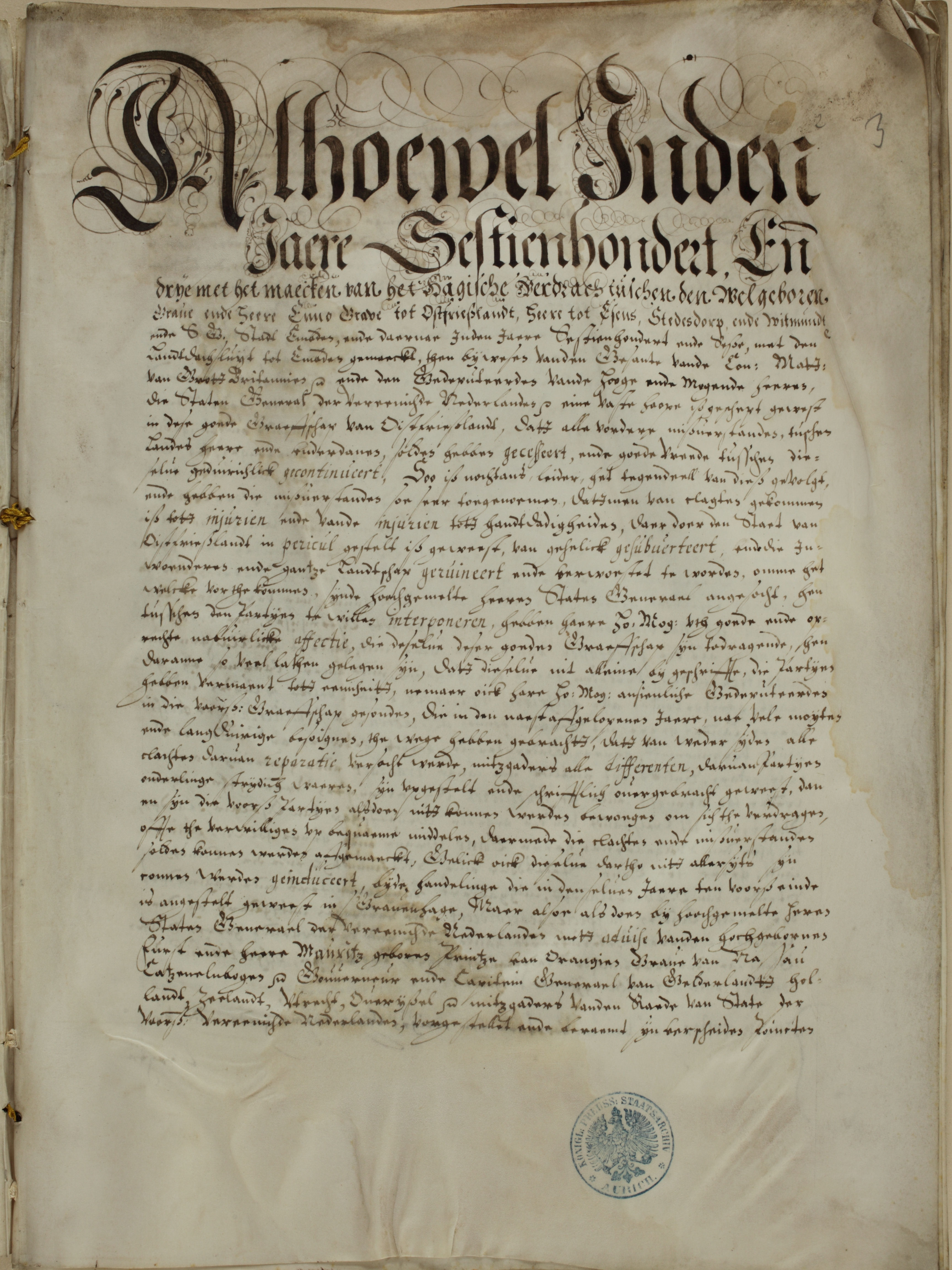 Der Schock saß tief, als am 13. September 1609 Soldaten der Garnison Emden nach dreitägiger Belagerung in die Auricher Residenz des Grafen Enno III. einfielen, die dort untergebrachte gräfliche Registratur plünderten und zahlreiche Kisten mit Urkunden und Akten fortschleppten. Der Überfall war ein planmäßig ausgeführtes Unternehmen der Stadt Emden in ihrem Kampf gegen den Landesherrn, um Enno III. eine Konspiration mit dem König von Spanien nachzuweisen.