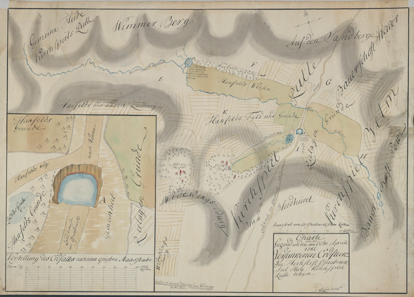 Am 22. April 1782 war auf der Heerstraße von Osnabrück nach Icker eine Frau im Kirchspiel Rulle unterwegs, als sich begleitet von einem heftigen unterirdischen sturmartigen Getöse ein Loch zunächst in der Größe eines Brunnens auf der Landstraße auftat. Sie alarmierte den Bauern Hanfeld auf dem nahegelegenen Hof, der sich das Loch ansah und beobachtete, wie die Erde von den Rändern weiter abbrach. Sofort machte Hanfeld Anzeige beim Obervogt Nieberg, der nach eigener Besichtigung den Weg durch eine Wache sperren ließ und sich am nächsten Tag in einem Schreiben Hilfe seitens der fürstbischöflichen Regierung erbat (NLA – Staatsarchiv Osnabrück Rep 100/188/58 Bl. 2f.).