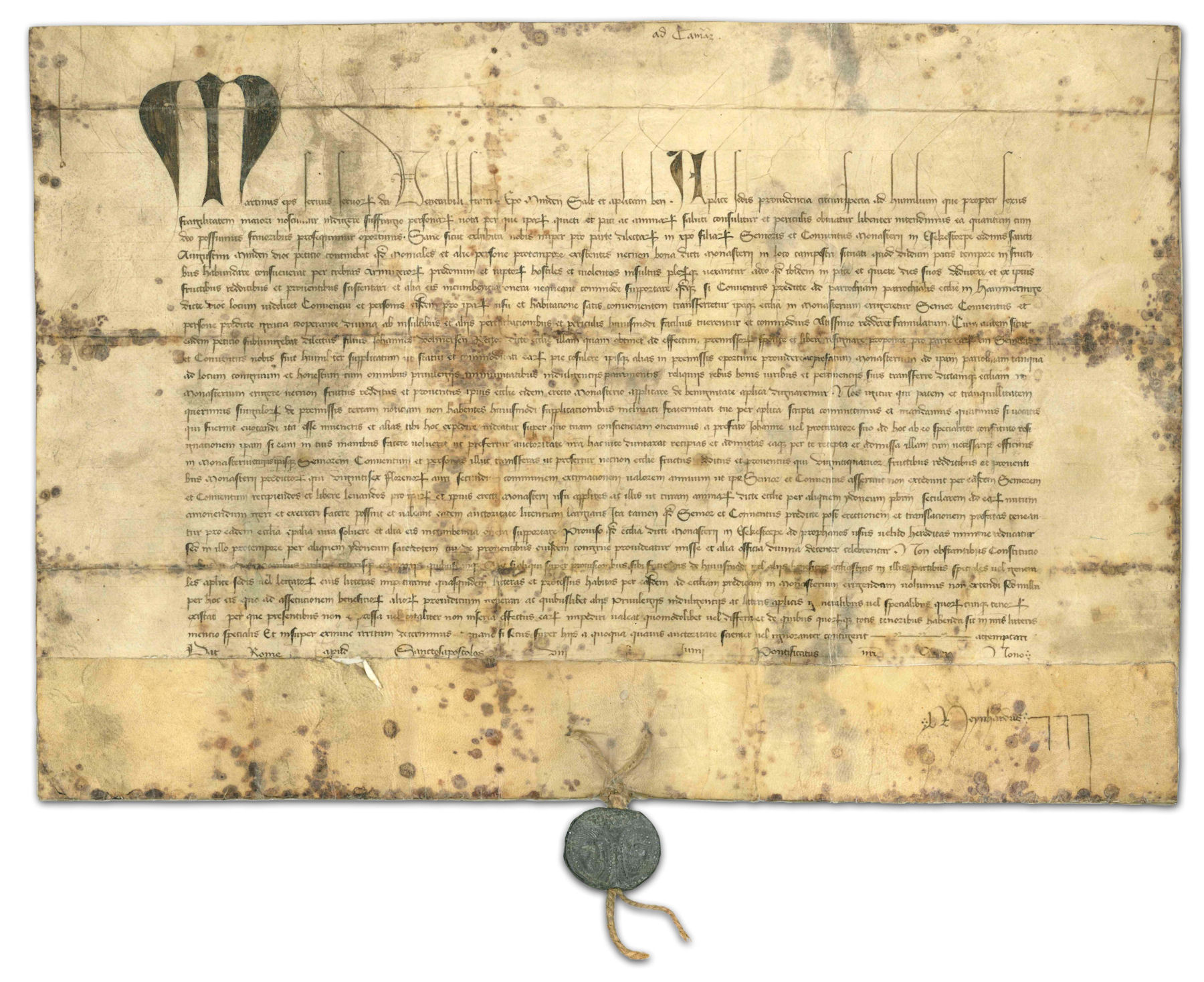 Bei der Papsturkunde handelt es sich um einen Hanfschnurbrief, eine typische Urkundenform der päpstlichen Kanzlei für die Erteilung konkreter Aufträge. Kennzeichen sind u.a. das Querformat, die geschwärzte Initiale, ein bestimmtes Protokoll mit Nennung des Ausstellers, des Adressaten und der Grußformel salutem et apostolicam benedictionem sowie – namensgebend – die Hanfschnur zur Befestigung der Bleibulle. Erkennbar sind an dieser Urkunde auch die Folgen unsachgemäßer Lagerung in der Vergangenheit: Durch Feuchtigkeit und anschließenden Pilzbefall entstanden bleibende dunkle Flecken.