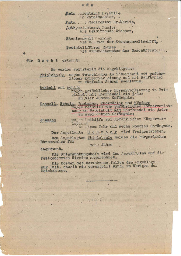 Nach der Verhaftung der Beteiligten ab Mai 1945 und der Wiederaufnahme der Ermittlungen im Februar 1946 fand der Prozess wegen Totschlags 1947 vor dem Landgericht Oldenburg statt. Der Hauptschuldige erhielt eine 15jährige Zuchthausstrafe.