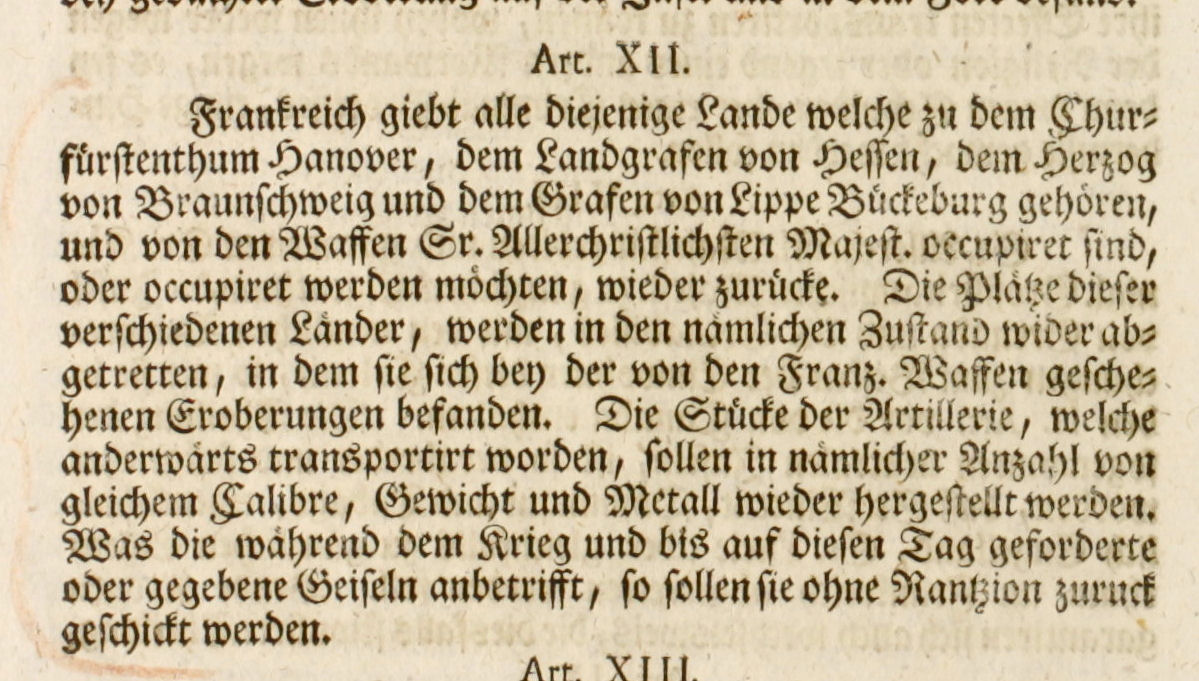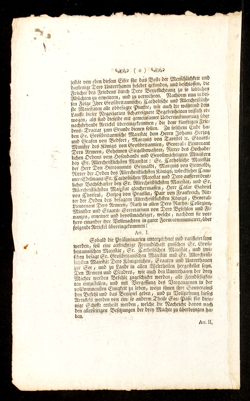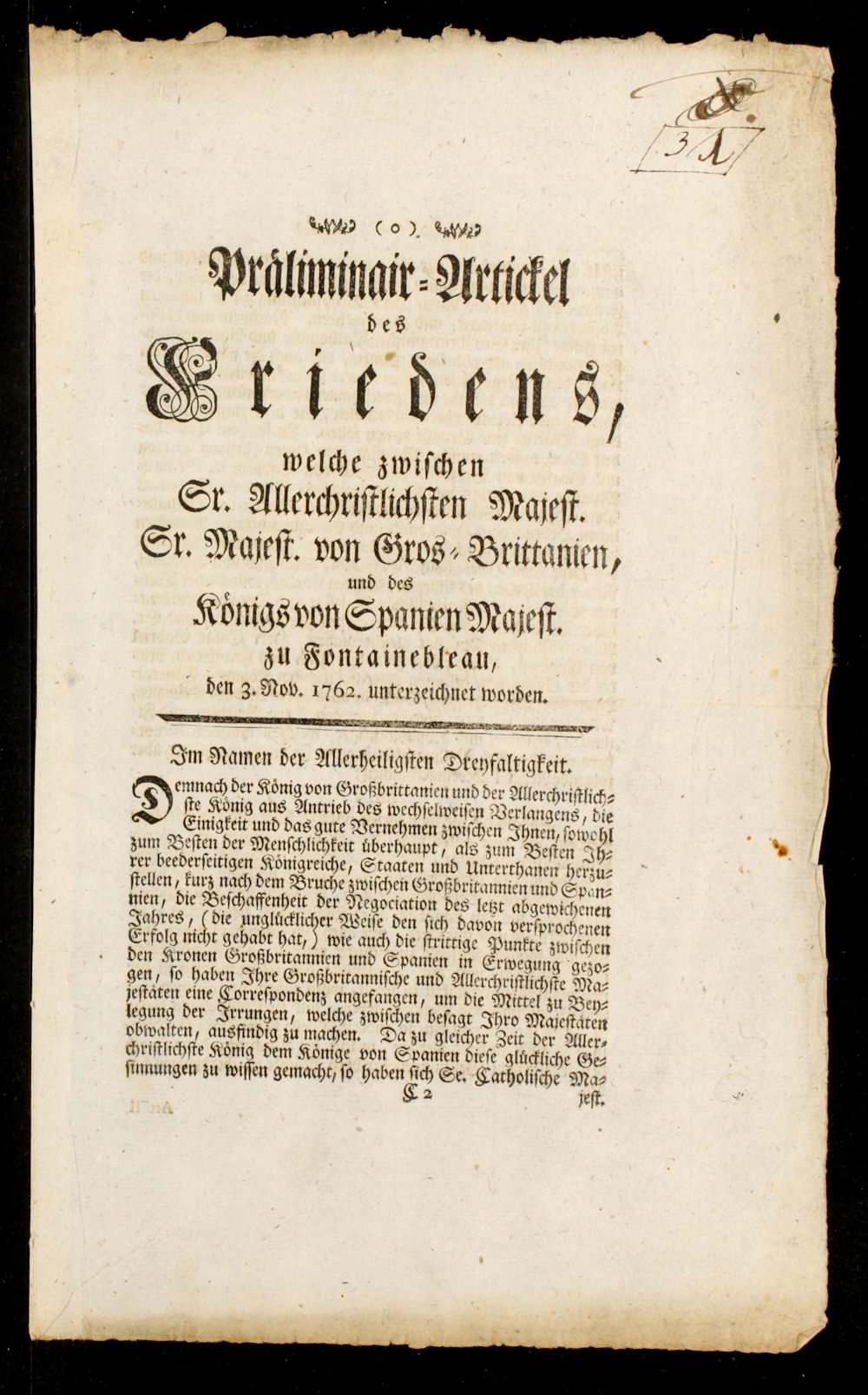 Praeliminair-Artickel des Friedens, welche zwischen Sr. Allerchristlichsten Majest. Sr. Majest. von Gros-Brittannien, und des Königs von Spanien Majest. zu Fontainebleau, den 3. Nov. 1762. unterzeichnet worden