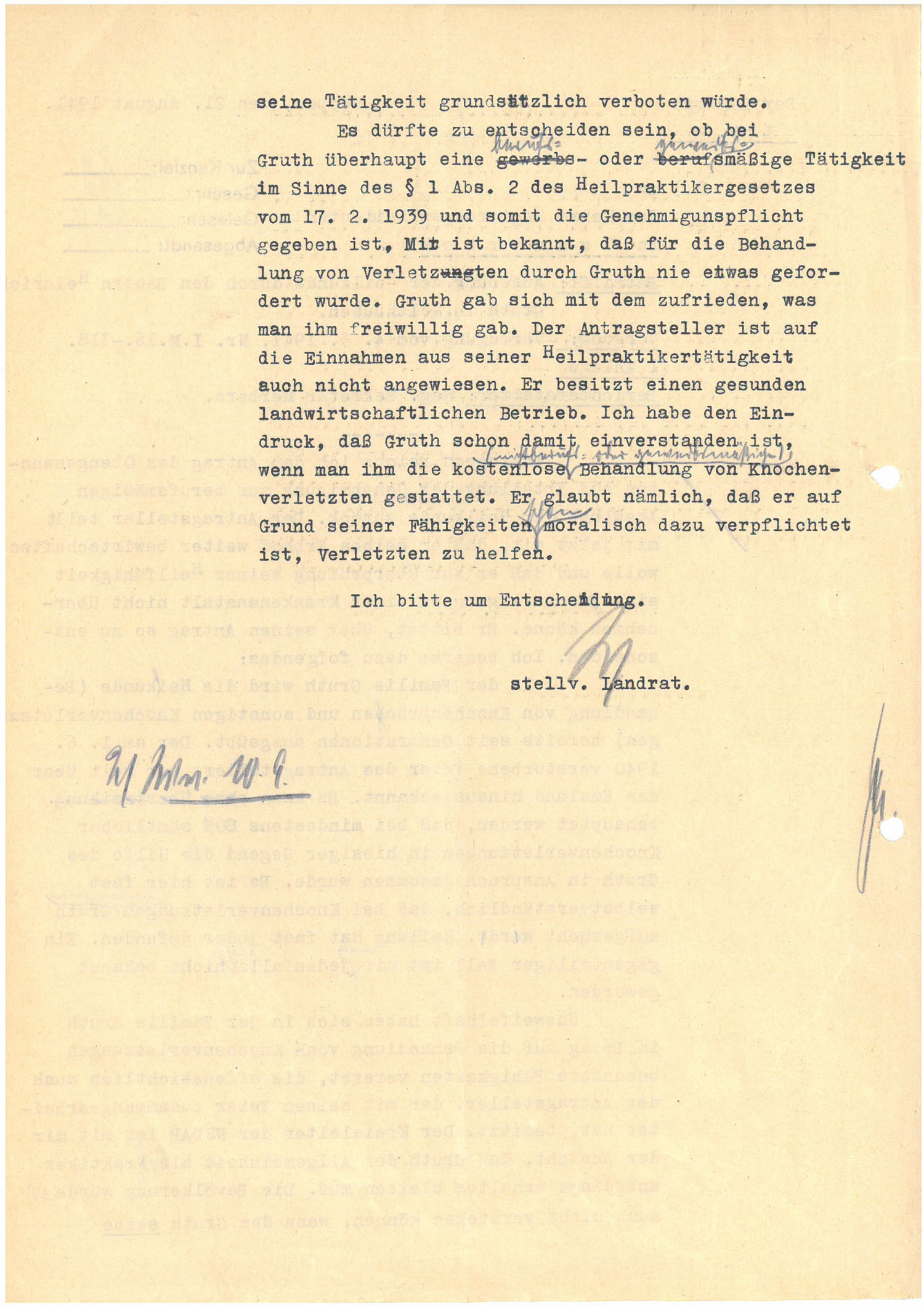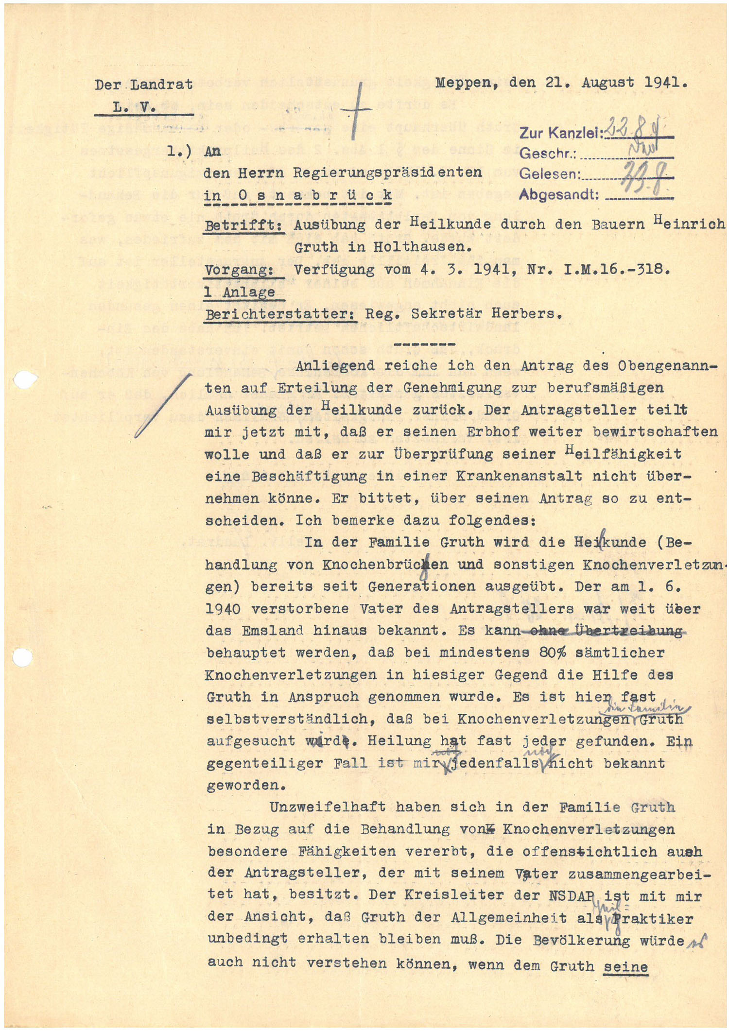 Am 21. August 1941 verwendete sich der Landrat von Meppen bei dem Regierungspräsidenten von Osnabrück dafür, Bauer Gruth aus Holthausen die Ausübung der Heilkunde zu gestatten. In der Familie Gruth werde die Heilkunde (Behandlung von Knochenbrüchen und sonstigen Knochenverletzungen) bereits seit Generationen ausgeübt. Bei mindestens 80% sämtlicher Knochenverletzungen im Landkreis Meppen habe man die Hilfe des Gruth in Anspruch genommen. Es sei hier fast selbstverständlich, dass bei Knochenverletzungen Gruth aufgesucht werde. Heilung habe fast jeder gefunden. Der Kreisleiter der NSDAP vertrete ebenfalls die Ansicht, dass Gruth der Allgemeinheit als Heilpraktiker unbedingt erhalten bleiben müsse. Die Bevölkerung würde kein Verständnis für ein derartiges Verbot aufbringen.