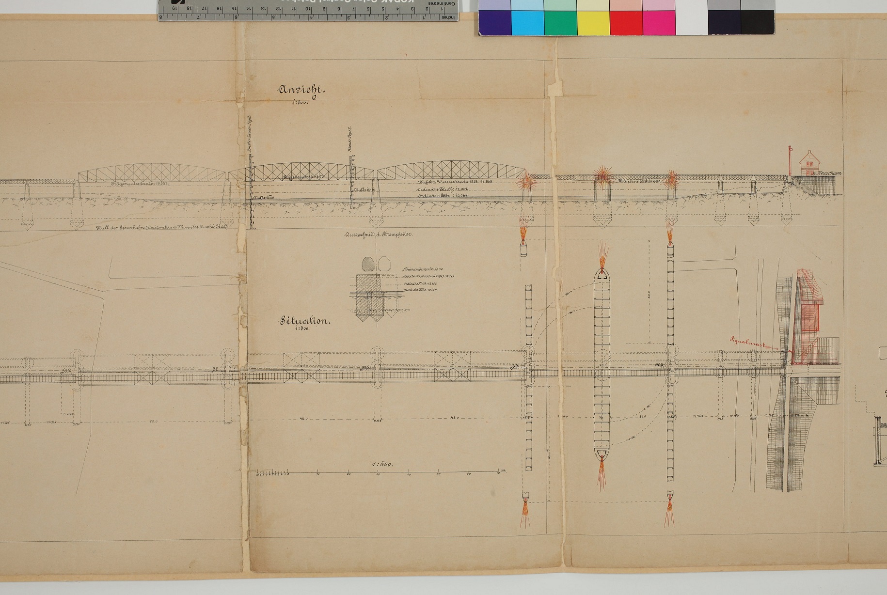 Lageplan und Skizze einer Eisenbahnbrücke über die Ems bei Weener (1870) (NLA - Aurich - Rep. 244 C Nr. 6494)