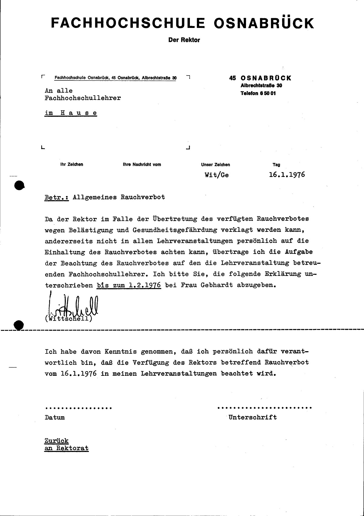 Dies führte dazu, dass der Rektor der Fachhochschule Osnabrück am 16. Januar 1976 ein allgemeines Rauchverbot im räumlichen Bereich der FH verhängte. Ausgenommen waren Kantinenräume und Flure, in denen Aschenbecher aufgestellt waren. Das Verbot galt eingeschränkt bei Aufenthalts- und Gemeinschaftsräumen sowie Dienstzimmern. Rauchen war hier möglich, sofern alle Anwesenden nichts dagegen einzuwenden hatten.