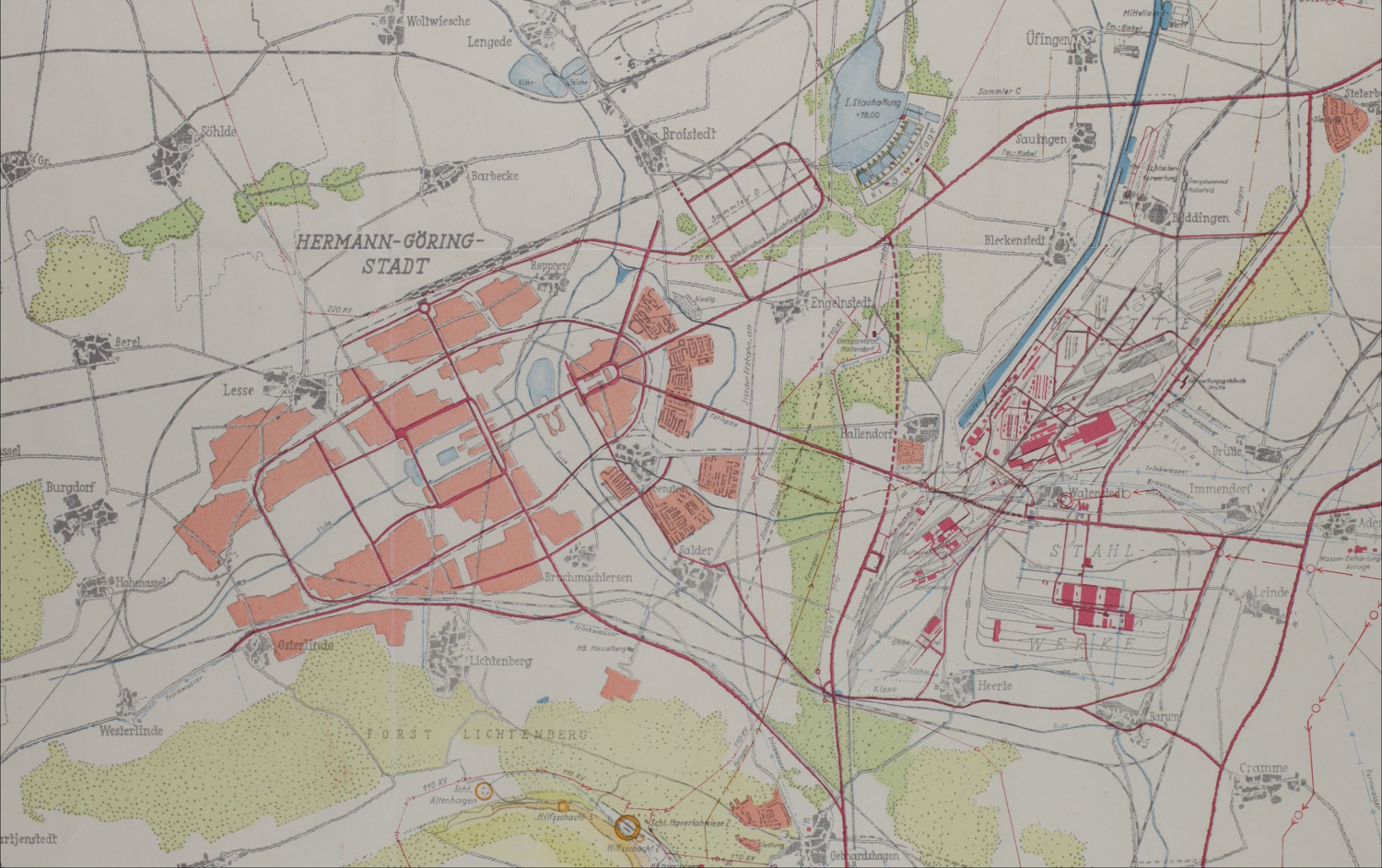 Ein so großes Stahlwerk benötigte viele Arbeiter und diese wiederum benötigten mit ihren Familien eine Stadt, in der sie leben konnten. Beides entstand ab dem Jahre 1937 faktisch auf der grünen Wiese zwischen Dörfern des Freistaats Braunschweig und der preußischen Provinz Hannover. Die Karte zeigt die großzügigen Planungen für eine Stadt mit bis zu einer Viertelmillion Einwohnern. Herbert Rimpl war der Architekt dieser Stadt, die alles bieten sollte, was der NS-Staat für eine Großstadt für wichtig hielt. Große Repräsentationsbauten des Regimes sollten dort Platz finden, aber auch weite Grünflächen zur Naherholung für seine Einwohner. Die geplanten Wohnsiedlungen mussten nach dem Willen der Partei einen deutlich besseren Standard bieten als gewohnt. Größer und besser in der Ausstattung sollten sie ihre Anziehungskraft auf Arbeitskräfte erhöhen. Dieser Aspekt geriet jedoch im Laufe des Zweiten Weltkriegs rasch in den Hintergrund. Die Hermann Göring Werke ließen sich Abertausende von Zwangsarbeitern zuführen und nutzten deren Arbeitskraft schonungslos aus. Die neue Stadt stand deshalb weniger für Modernität und Wohnkomfort als viel mehr für ein unmenschliches Lagersystem, das vielen das Leben kostete.