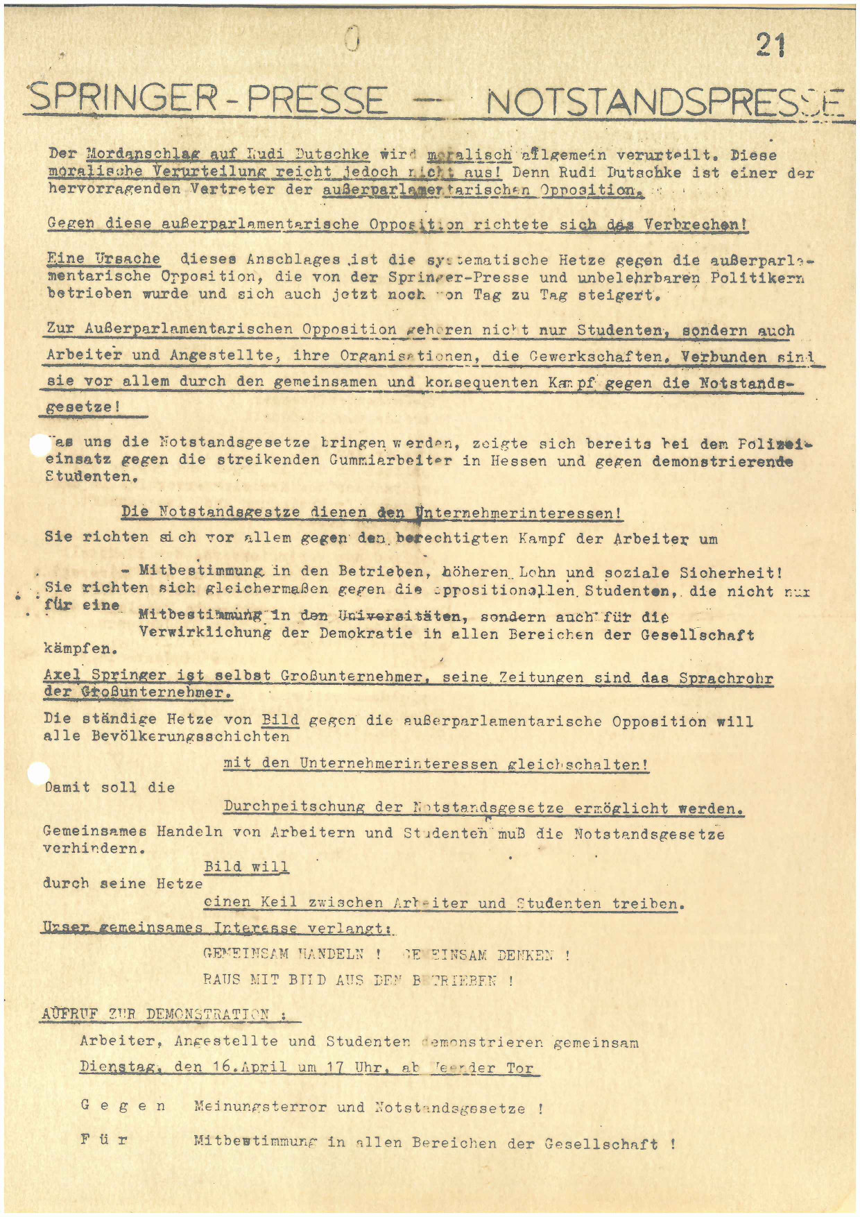 Aufruf zur Demonstration in Göttingen anlässlich des Attentats auf Rudi Dutschke im April 1968 NLA - Hannover, Nds. 100 Acc. 186/94 Nr. 15 Bl. 21