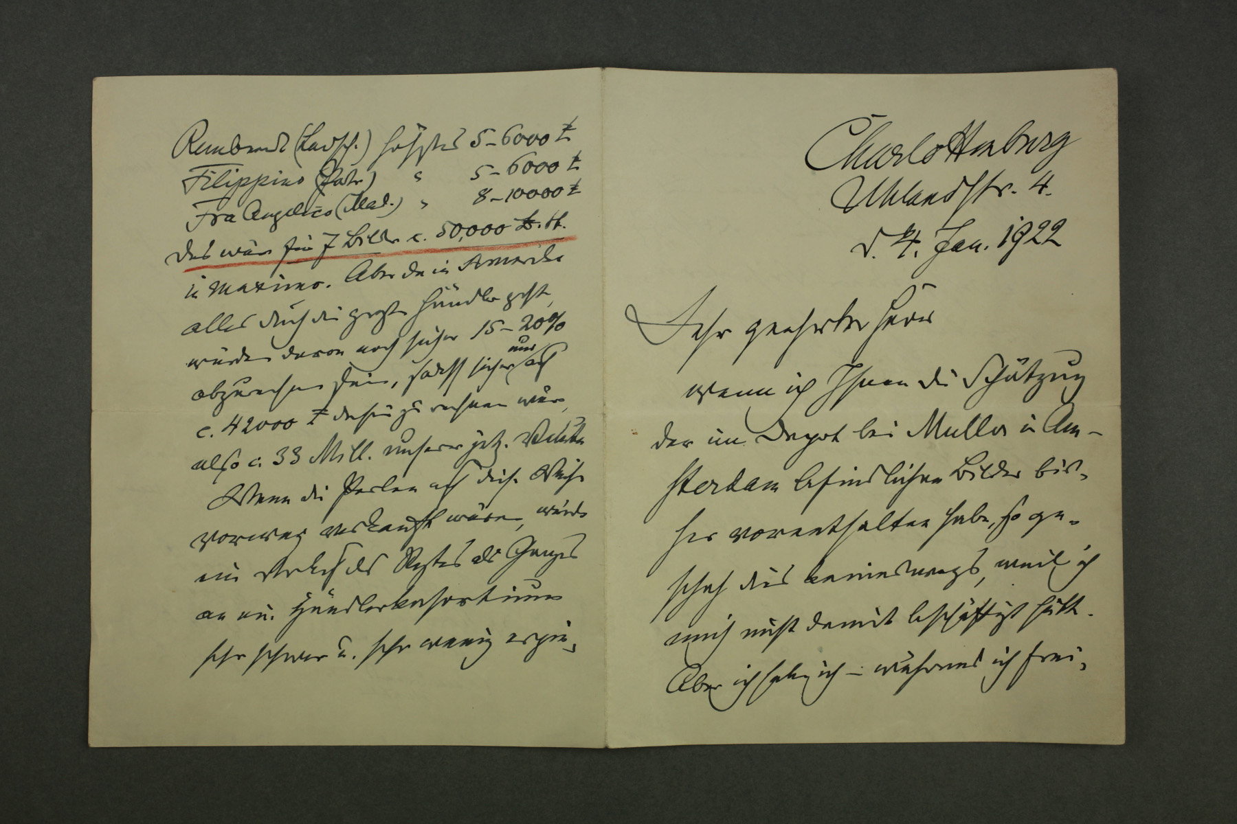 Brief des Berliner Museumsdirektors Wilhelm von Bode (1845-1929) vom 4. Januar 1922 an den Oldenburger Hofrat Friedrich Husmann (1883-1950) wegen des Verkaufs von Teilen der Großherzoglichen Gemäldegalerie ins Ausland nach dem Ende des Ersten Weltkriegs