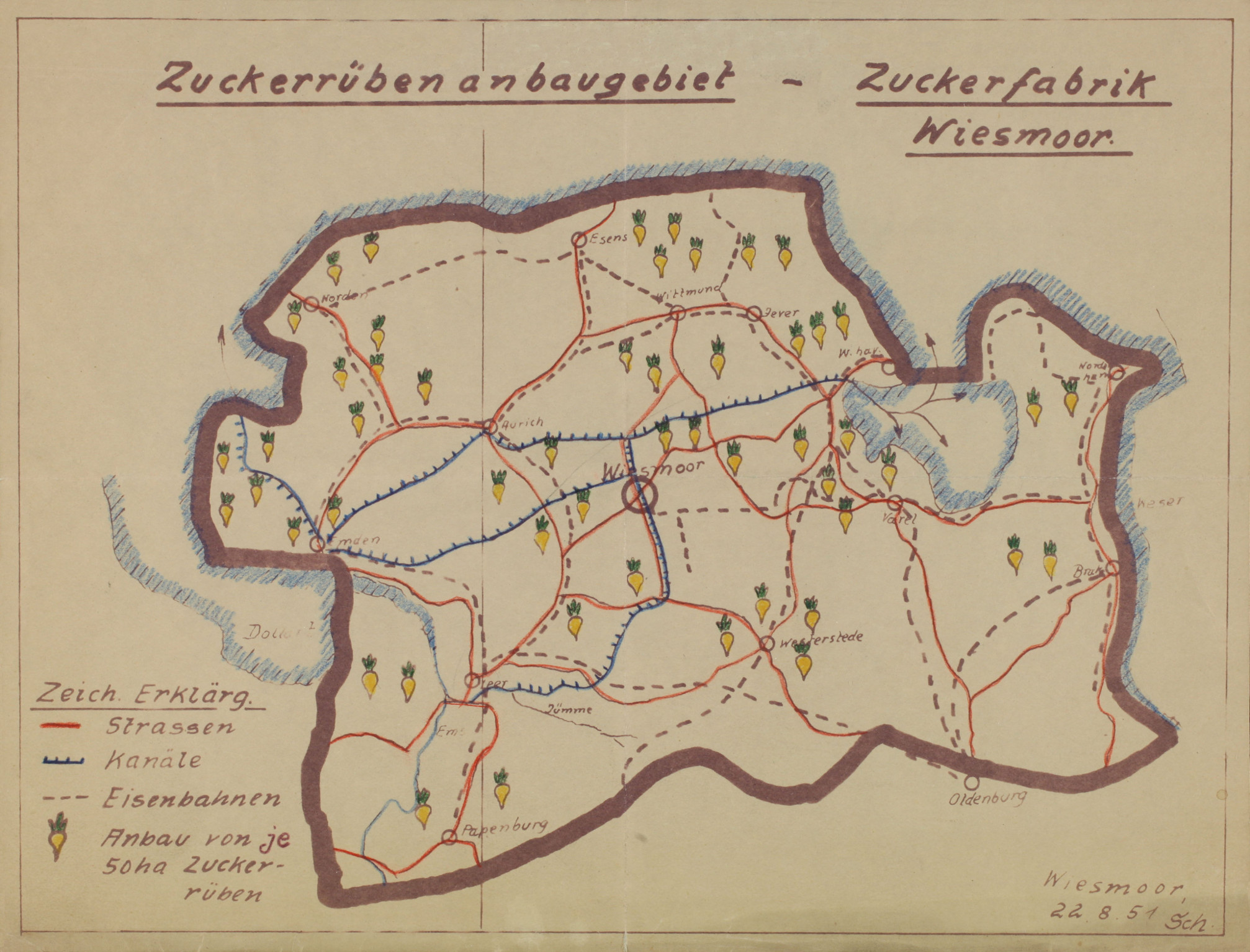 Als der Direktor des Torfkraftwerks der Nordwestdeutschen Kraftwerke AG in Wiesmoor, Jan Hinrichs, diese colorierte Karte im August 1951 auf einer Besprechung in Emden vorstellte, wurde noch heftig um den vermeintlich besten Standort einer neuen und mit ECA-Mitteln geförderten Zuckerrübenfabrik in Ostfriesland gestritten: Emden, Leer und Wiesmoor hatten ihre Ansprüche angemeldet. Hinrichs wollte mit dieser Karte demonstrieren, dass um Wiesmoor herum bis in die Wesermarsch hinein ausreichend Rüben für eine Zuckerfabrik angebaut werden könnten, dass „seine“ Gemeinde sozusagen in der Mitte Ostfrieslands lag und dass durch Fehnkanäle, Eisenbahnverbindungen und Straßen der Antransport des Rohstoffs Rüben und der Abtransport der als Viehfutter angefallenen, begehrten Trocken- und Rübenschnitzel gewährleistet war.