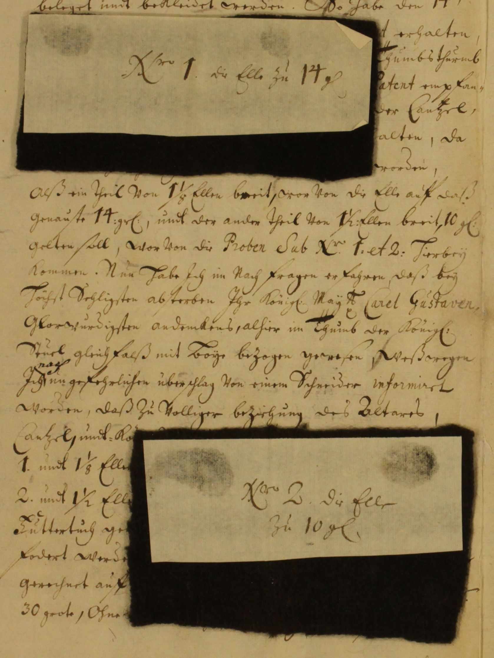 Proben von zwei schwarzen Tuchen (Boye) für die Trauerbekleidung in der Bremer Domkirche anlässlich des Todes der schwedischen Königin Ulrica Eleonora im Juli 1693 (NLA ST Rep. 5a Nr. 1365 Bl. 60-62)
