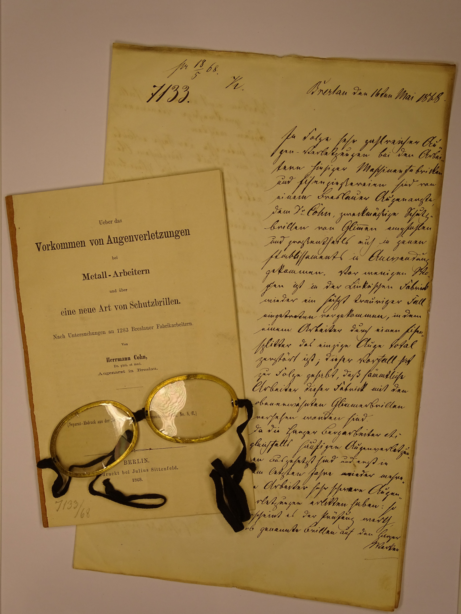 Im Mai 1868 erreichte das Preußische Oberbergamt Clausthal ein Schreiben des Breslauer Berggeschworenen Neimke. Darin übersendete er eine Glimmerschutzbrille sowie eine Studie des Breslauer Augenarztes Dr. Hermann Cohn an 1283 Breslauer Fabrikarbeitern über das Vorkommen von Augenverletzungen bei Metallarbeitern. Neimke schlug vor, die bereits erfolgreich bei den Breslauer Metallarbeitern getesteten, neuartigen Glimmerbrillen auch im hiesigen Bergbau einzuführen.