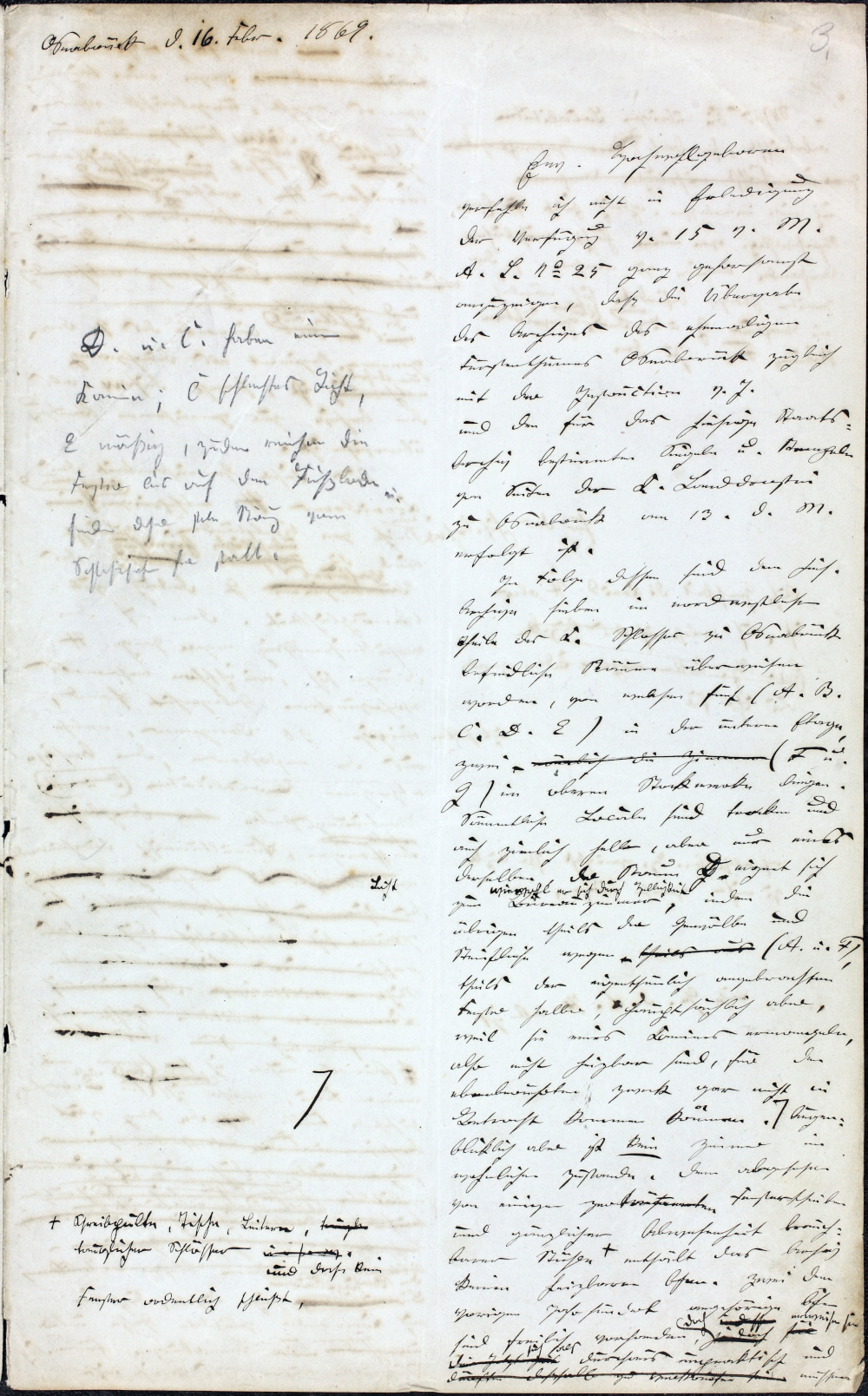 Tatsächlich verschoben sich die Errichtung des Archivs und die Übernahme der Geschäfte auf den Februar 1869. Für die Aufgabe war wieder ein Archivar aus dem Königlich Preußischen Staatsarchiv in Münster ausgewählt worden, Dr. Hermann Veltmann. Aus dem hier abgebildeten Konzept eines Schreibens vom 16. Februar an den Direktor des Staatlichen Archive in Berlin (NLA OS Rep 400 Akz. 2001/51 Nr. 89) geht hervor, dass er seinen Dienst am 13. Februar antrat. Der Befund der zur Verfügung stehenden Räumlichkeiten, den er mit diesem Schreiben mitteilte, war allerdings wenig erfreulich. Zwar standen sieben Räume zur Verfügung. Nur einer hatte einen Kamin und hätte beheizt und so als Büroraum benutzt werden können. Funktionierende Öfen waren jedoch nicht vorhanden, lediglich zwei aus dem vorigen Jahrhundert stammende, deren Einsatz nicht mehr ratsam erschien. Zerbrochene Fensterscheiben, zugige Fenster, keine Schreibpulte, Tische, Leitern, keine Schlösser an den Türen, von den Decken rieselnder Staub und Putz rundeten das Bild ab. Erschwerend kam hinzu, dass sich das Archiv den Korridor mit dem in angrenzenden Räumen untergebrachten Dragonerregiment teilen musste, was eine sichere Separierung des Archivguts unmöglich machte und für Unordnung und Reibereien sorgte.