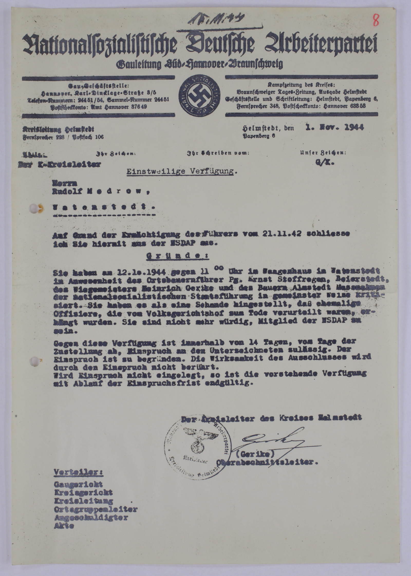 Zu Recht stehen Protagonisten des Attentats auf Hitler in diesen Tagen im Mittelpunkt des Interesses. Unter ihnen auch der ehemalige Wolfenbütteler Lehrer Werner Schrader (1895-1944), der mit anderen den Sprengstoff für Stauffenberg lieferte und dafür mit dem Leben bezahlte. Die Wirkung des Attentats und seine Wirkung auf die Bevölkerung vor 75 Jahren scheint dagegen bisher wenig untersucht worden zu sein. Was dachte der „Normalbürger“, Frauen und Männer, über die Verschwörer des 20. Juli und die Folgen ihrer Tat im Sommer/Herbst 1944? Tatsächlich scheint die Spurensuche hier schwierig zu sein. In den inzwischen gut erschlossenen Wiedergutmachungs- und Entnazifizierungsakten des Niedersächsischen Landesarchivs stößt man jenseits der am Attentat Beteiligten kaum auf Hinweise. Doch nicht alle schwiegen, wie der Fall von Rudolf Modrow aus Watenstedt bei Helmstedt zeigt.