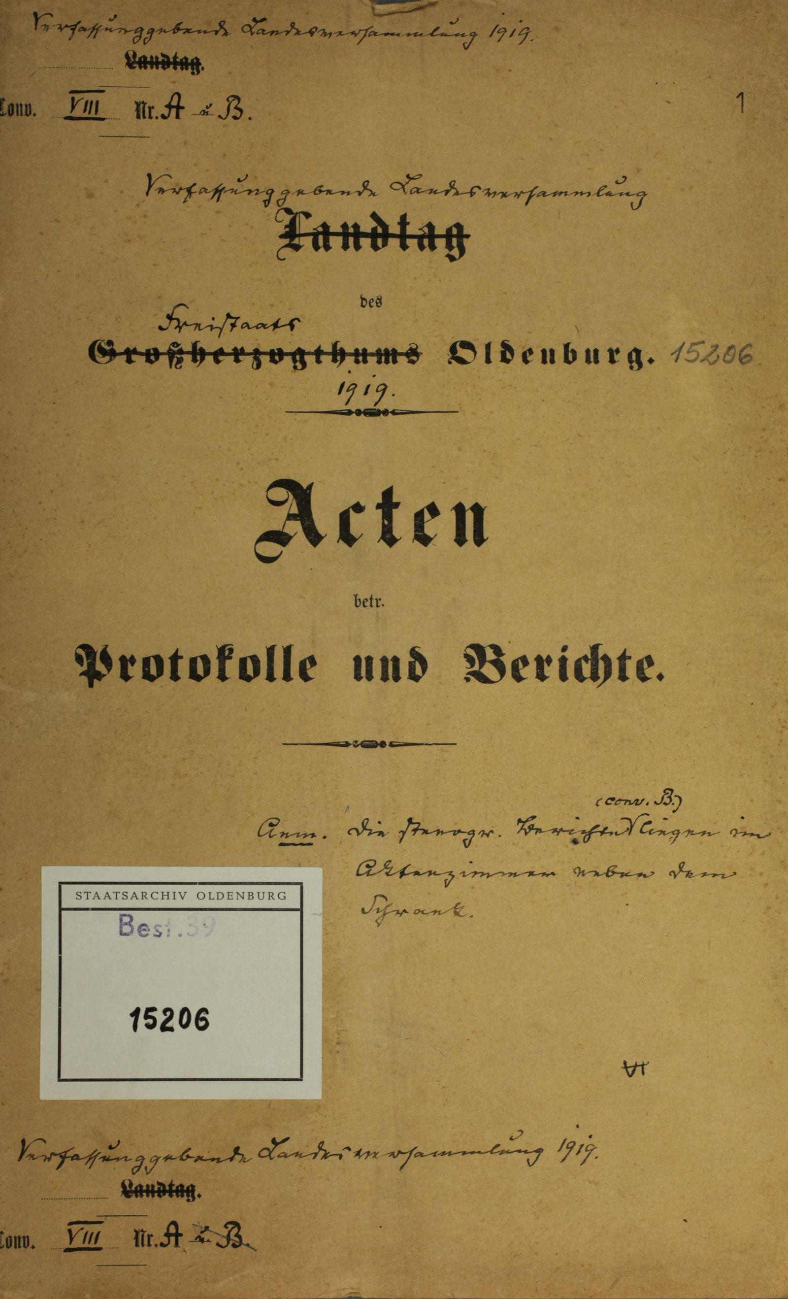 Oldenburgs Freistaats-Verfassung vom 17. Juni 1919 (NLA OL Best. 39 Nr. 15206)