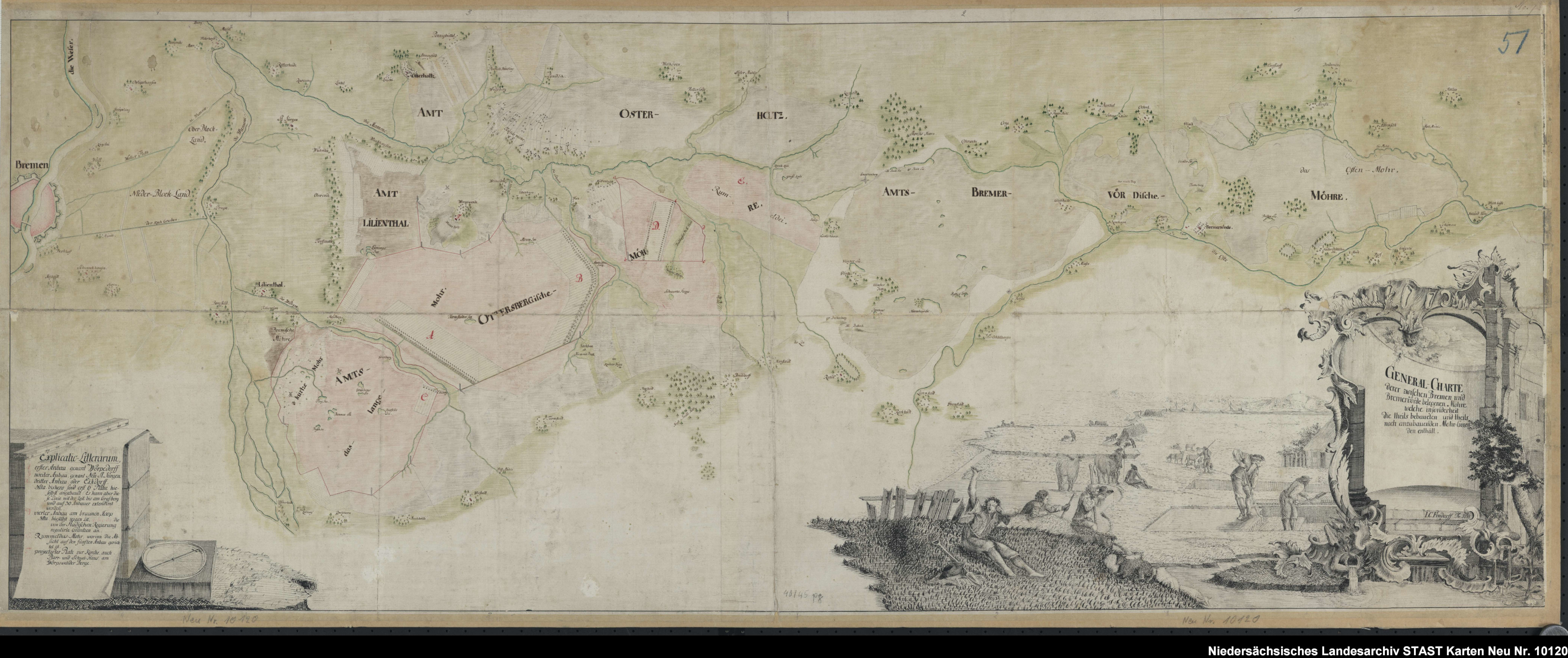 Die abgebildete Karte, die nach Nordwesten ausgerichtet ist, stammt aus der Frühzeit der Moorkolonisation zwischen Bremen und Bremervörde. In roter und bräunlicher Färbung sind die weiten Moore dargestellt. Erst bei genauerem Hinsehen erkennt man im Bereich des Amtes Ottersberg in der linken Kartenhälfte die regelmäßigen, linearen Strukturen der ersten Moorsiedlungen, die mit Buchstaben gekennzeichnet sind: Wörpedorf (A), Neu St. Jürgen (B) und Eickedorf (C).