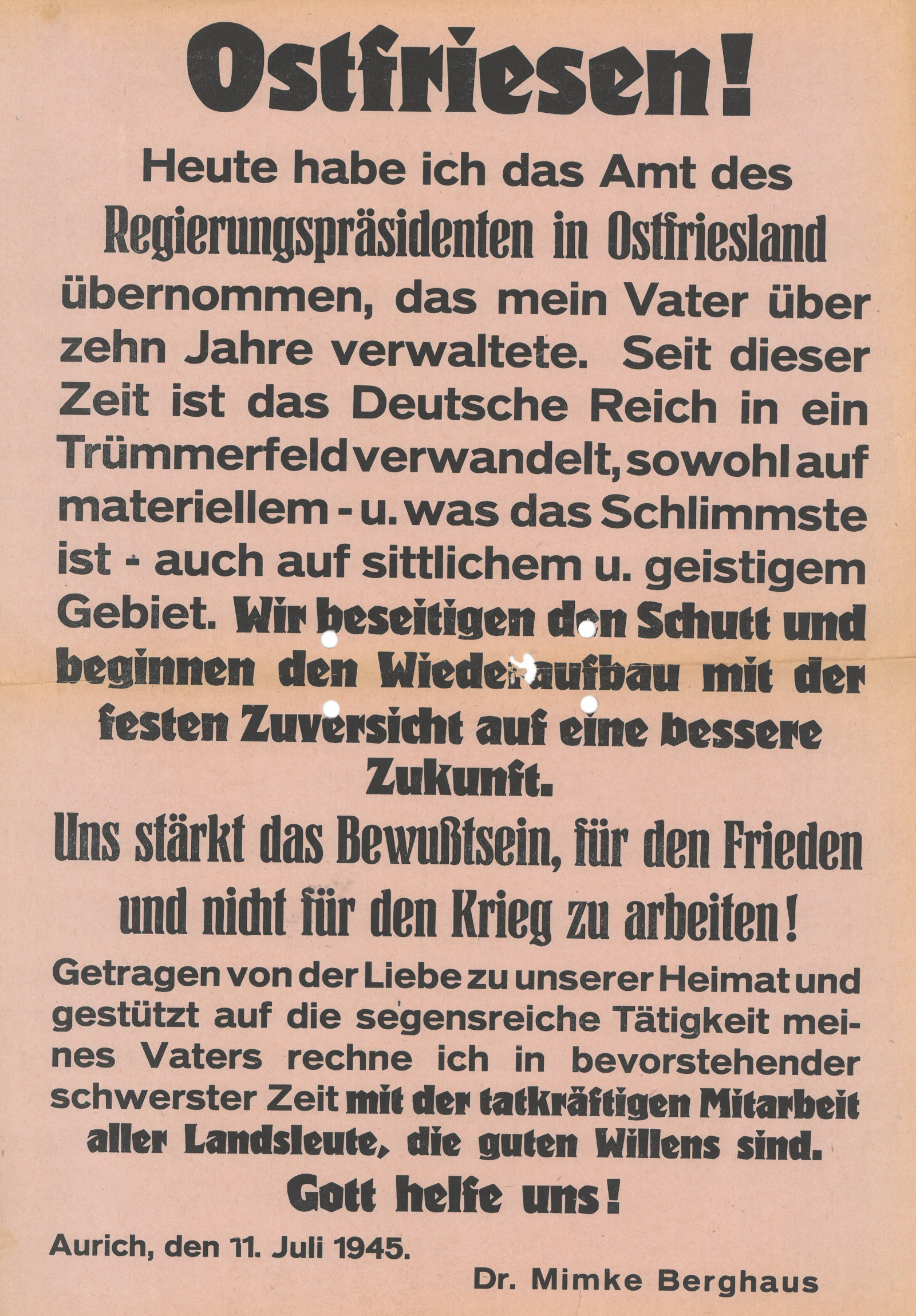 Insbesondere den Wiederaufbau hatte Mimke Berghaus zu seiner Hauptaufgabe erkoren. Bereits einen Tag nach seiner Ernennung zum Regierungspräsidenten am 10. Juli 1945 wandte er sich mit einem Plakat an die ostfriesische Bevölkerung. In diesem Aufruf versuchte er jeden Einzelnen „mit der festen Zuversicht auf eine bessere Zukunft“ für den notwendigen Wiederaufbau zu gewinnen. Alle sollten daran mitarbeiten, den Schutt des Trümmerfeldes, den das nationalsozialistische Regime hinterlassen hatte, zu beseitigen. Es zeichnet Berghaus aus, dass er dabei nicht nur die zerstörten Bauten, wie z.B. in Emden, im Blick hatte, sondern auch den durch das NS-Regime verursachten moralischen Verfall.