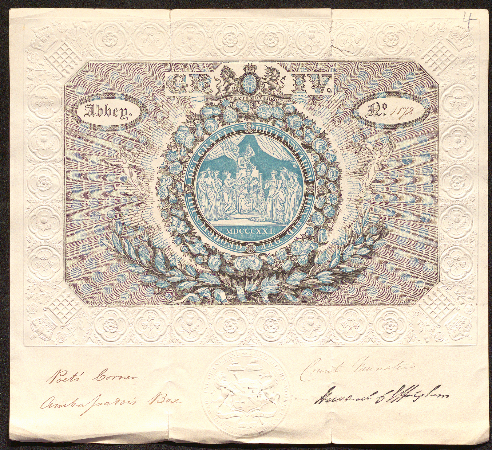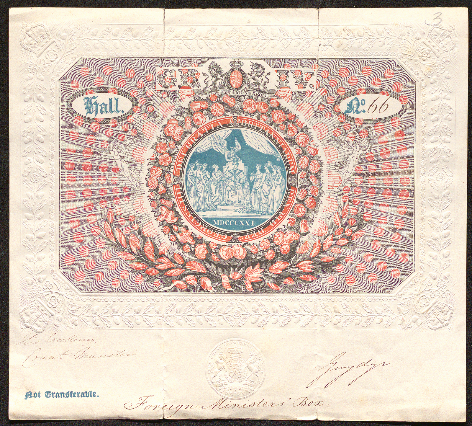 Deren Leiter als Staats- und Kabinettsminister war seit 1805 Ernst Friedrich Herbert Graf zu Münster. Der enge Vertraute des Königs erkundigte sich einerseits nach dessen Wünschen für Feierlichkeiten in Hannover, war aber andererseits auch Ansprechpartner des königlichen Zeremonienmeisters Sir Robert Chester hinsichtlich der Teilnahme von Deutschen an den Festivitäten in London. Als hochrangiger Minister wünschte Graf Münster für sich und seine Gäste zunächst eine separate Loge („a separate Box at the Coronation for the use of the Hanoverian Minister of State“), begnügte sich dann aber, bei der Krönungszeremonie in Westminster Abbey in der Loge der Botschafter („Ambassador’s Box“) und beim anschließenden Krönungsbankett in der Westminster Hall in der Loge der auswärtigen Minster („Foreign Ministers‘ Box“) untergebracht zu werden. Für beide Örtlichkeiten wurden ihm persönliche, nummerierte und von den jeweiligen Organisatoren unterschriebene Eintrittskarten zugestellt. Diese zeigen in einem Medaillon die Krönung Georgs IV., der thronend die Insignien seiner Regentschaft empfängt und von allegorischen Personifikationen seiner beherrschten Länder und königlicher Tugenden umringt wird.