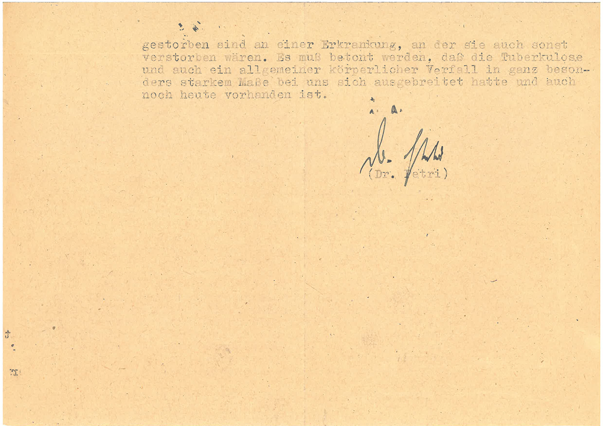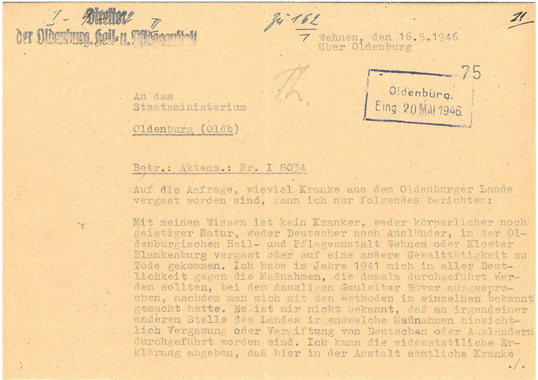 Im Mai 1946 hielt der oldenburgische Ministerpräsident Theodor Tantzen den Zeitpunkt für gekommen, eine Bilanz der menschlichen und materiellen Schäden der NS-Diktatur im Freistaat Oldenburg zu ziehen. Dazu erhielten alle staatliche Behörden und Einrichtungen einen Fragebogen. So hatte die Heil- und Pflegeanstalt in Wehnen bei Oldenburg darüber zu berichten, wie viele Kranke „vergast“ worden seien. Dem Anstaltsdirektor Dr. Petri, der sich in einer heiklen Lage befand, weil er seit 1937 die Verantwortung für die Behandlung der Kranken getragen hatte, eröffnete diese Formulierung ein Schlupfloch. Denn er konnte wahrheitsgemäß sagen, dass niemand vergast worden war, dass das Krankenhaus nicht an der berüchtigten „T4-Aktion“ teilgenommen hatte. Tatsache war jedoch, dass bereits seit 1935 aus finanziellen wie ideologischen Gründen die Kranken inhuman behandelt worden waren. Es herrschten dauernde und drastische Überbelegung bei gleichzeitiger Unterversorgung an ärztlicher Hilfe, Nahrung, Desinfektion und Heizung. Hatte die jährliche Sterberate 1928 bei 5,3 Prozent von 298 Kranken gelegen, so waren es 1944 23,68 % von 806 Insassen. Wer keine zusätzlichen Lebensmittel von Angehörigen bekam und nicht über eine robuste körperliche Gesundheit verfügte, hatte schlechte Überlebensaussichten. Diese Zustände waren kein Geheimnis, in der Bevölkerung hatte die Anstalt einen schlechten Ruf, der bis in 1970er Jahre anhielt. Petri wurde noch 1946 entlassen, vor allem, weil er als überzeugter Nationalsozialist galt. 1948 nahm er sich das Leben. Danach wurde es leicht, die gesamte Verantwortung auf ihn abzuschieben. Die Beamten und Amtsärzte, die über die Situation in Wehnen informiert gewesen waren und nichts zum Schutz der Patienten unternommen hatten, wurden nie belangt.