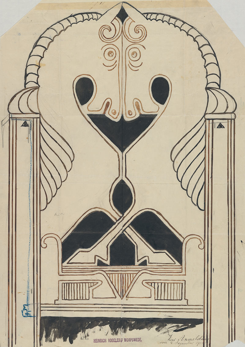 Der vor 150 Jahren am 12. Dezember 1872 geborene Heinrich Vogeler hatte viele künstlerische Begabungen. Er war unter anderem Maler, Grafiker, Pädagoge und Schriftsteller. Auch als Designer betätigte er sich erfolgreich, wie die in der Abteilung Stade lagernden Musterzeichnungen für Worpsweder Bauernmöbel zeigen. Gemeinsam mit seinem Bruder Franz Vogeler betrieb er auf seinem Barkenhoff Werkstätten für Stühle, Sessel und anderes Mobiliar. Zwei seiner erfolgreichsten Entwürfe waren Stühle mit einer stilisierten Tulpe und zwei einander zugewandten Pferdeköpfe als Lehnen (s. Abb. links).