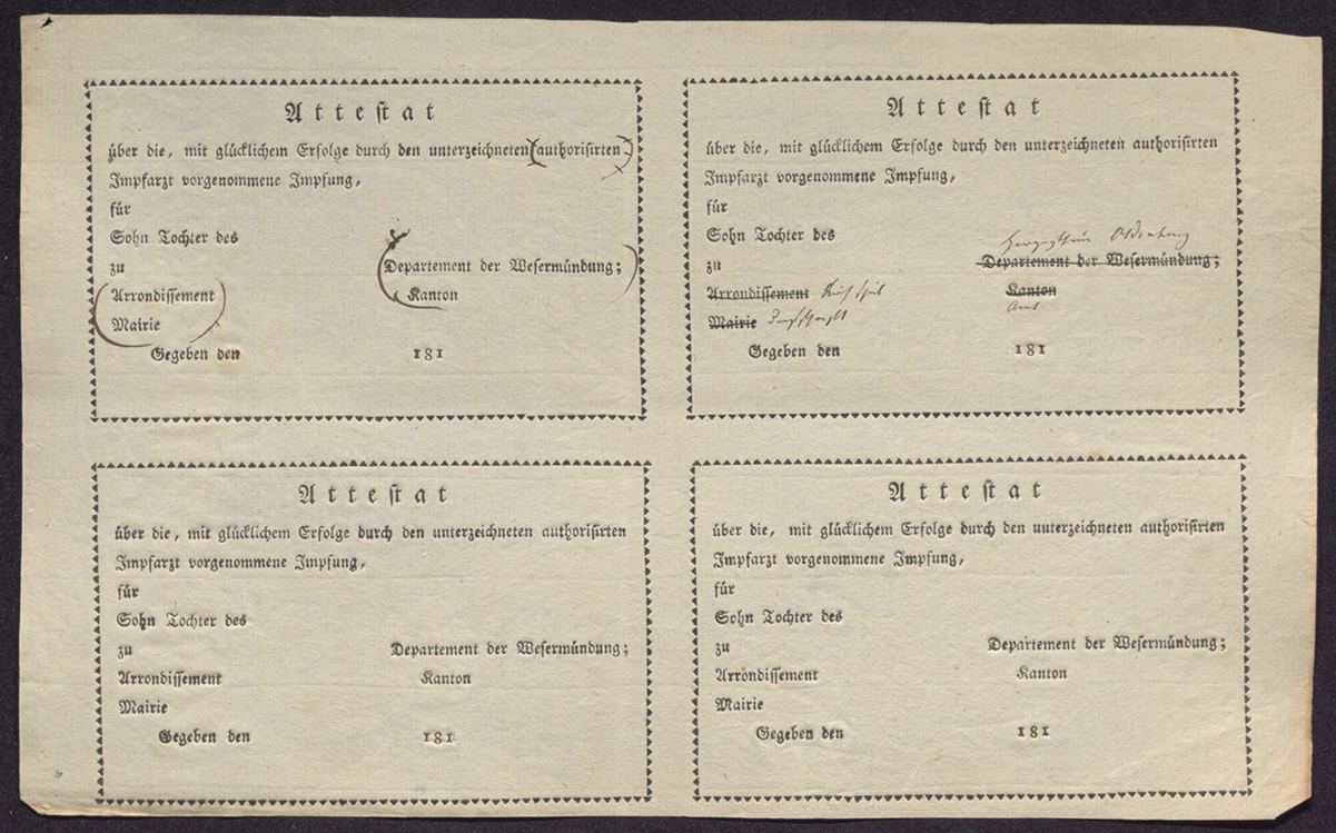 Schon in naher Folge zum Wirksamkeitsnachweis dieser sog. Schutzblattern-Impfung wurde das Impfwesen ab dem Ende des Jahres 1800 auch im Oldenburger Raum vorangetrieben. Geht die breitere Durchsetzung der Pockenschutzimpfung in Oldenburg sodann auf die Zeit der französischen Herrschaft zurück, so orientierte sich die (groß-) herzogliche Regierung 1815 auch in der Konzeption eines Impfnachweises an französischem Vorbild.