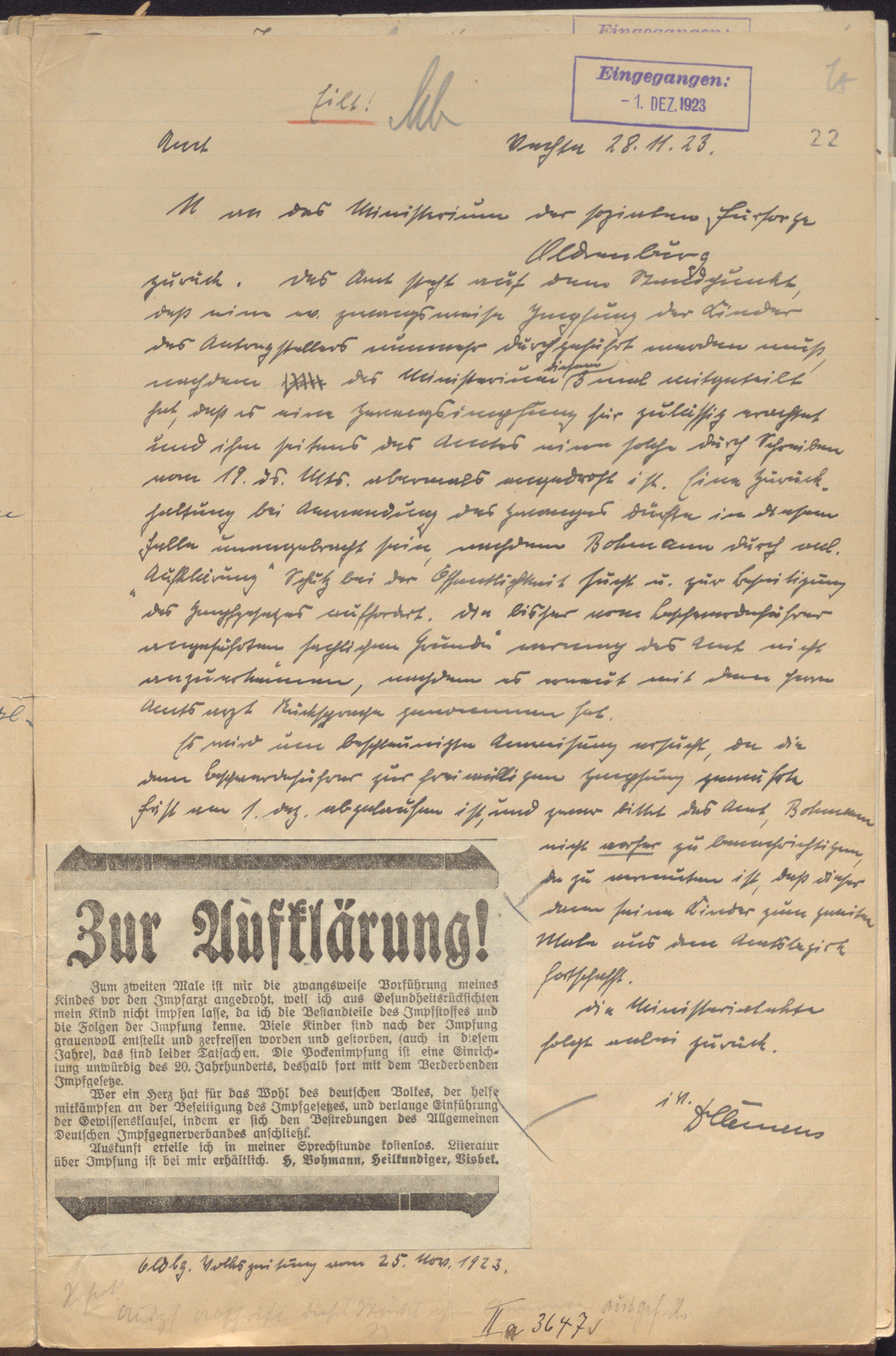 Hierbei wurde die im jungen Kaiserreich schließlich aus dem 1874 verabschiedeten „Reichsimpfgesetz“ folgende Pflicht zur Pockenschutzimpfung aller ein- und zwölfjährigen Kinder nicht in jedem Fall bereitwillig angenommen. Die zeitgenössisch durchaus nicht singulär auftretenden, sondern seit Ende des 19. Jahrhunderts in zahlreichen Vereinen institutionalisierten und international vernetzten Impfgegner wussten dabei auch im Freistaat Oldenburg schon in den 1920er Jahren die Kraft der Medien zur selbsterklärten „Aufklärung“ der Öffentlichkeit über die Pockenimpfung zu nutzen.