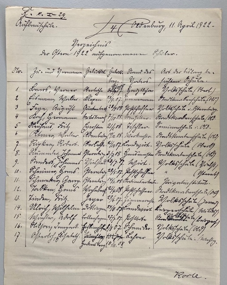 In Oldenburg ist jedem klar, was mit dieser Aussage gemeint ist. Denn die ‚Graf-Anton-Günther-Schule‘, eines der Gymnasien in der Stadt, kennen die meisten unter der umgangssprachlichen Abkürzung GAG. Sie ist zwar längst nicht die älteste Lehranstalt der Stadt, hat aber inzwischen Tradition und ist beliebt. Im Jahr 1922 wurde sie zunächst unter der Bezeichnung „Aufbauschule“ gegründet. Inzwischen prägt sie seit einem Jahrhundert Generationen von Schülerinnen und Schülern in Oldenburg. Wie fing damals alles an? Eine Namensliste des ersten Jahrgangs mit 15 Jungen und 2 Mädchen ist in der Abteilung Oldenburg des Niedersächsischen Landesarchivs überliefert. Darin sind auch Geburtsort und -datum, der Beruf des Vaters sowie die bisher besuchte Schule der Kinder vermerkt.