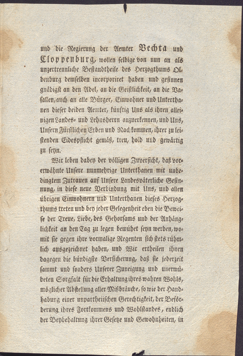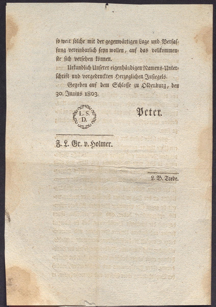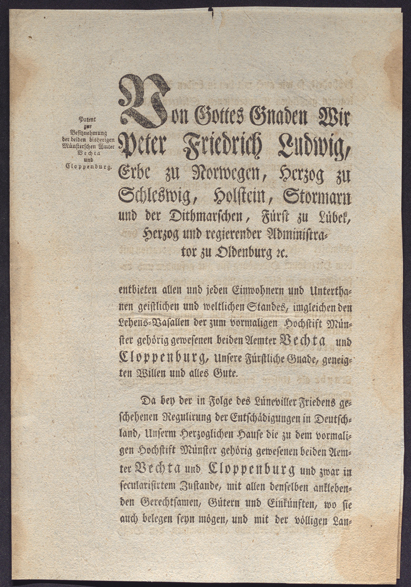 Der in diesem Zusammenhang für Außenstehende mitunter etwas sperrig oder gar widersprüchlich anmutende Rekurs auf die Region als »Oldenburger Münsterland« ist dabei als Folge der in diesem Jahr mit einem Jubiläum verbundenen politischen Entwicklung bzw. Zuordnung der Region geprägt worden: Vor nunmehr 220 Jahren gelangten die bis dahin zum Gebiet des vormaligen Fürstbistums bzw. Niederstifts Münster gehörenden Ämter Vechta und Cloppenburg im Zuge des Reichsdeputationshauptschlusses 1803 zum Herzogtum Oldenburg. Nachdem die zum Ausgleich linksrheinischer Gebietsverluste im Zuge der napoleonische Expansionspolitik ausgehandelte Einigung am 25. Februar 1803 in Regensburg gefasst wurde, unterzeichnete der Oldenburger Herzog und Administrator Peter Friedrich Ludwig das entsprechende Patent zur Besitznehmung der beiden bisherigen Münsterschen Ämter Vechta und Cloppenburg am 30. Juni 1803 (NLA OL Best. 76-24 a Nr. 1).