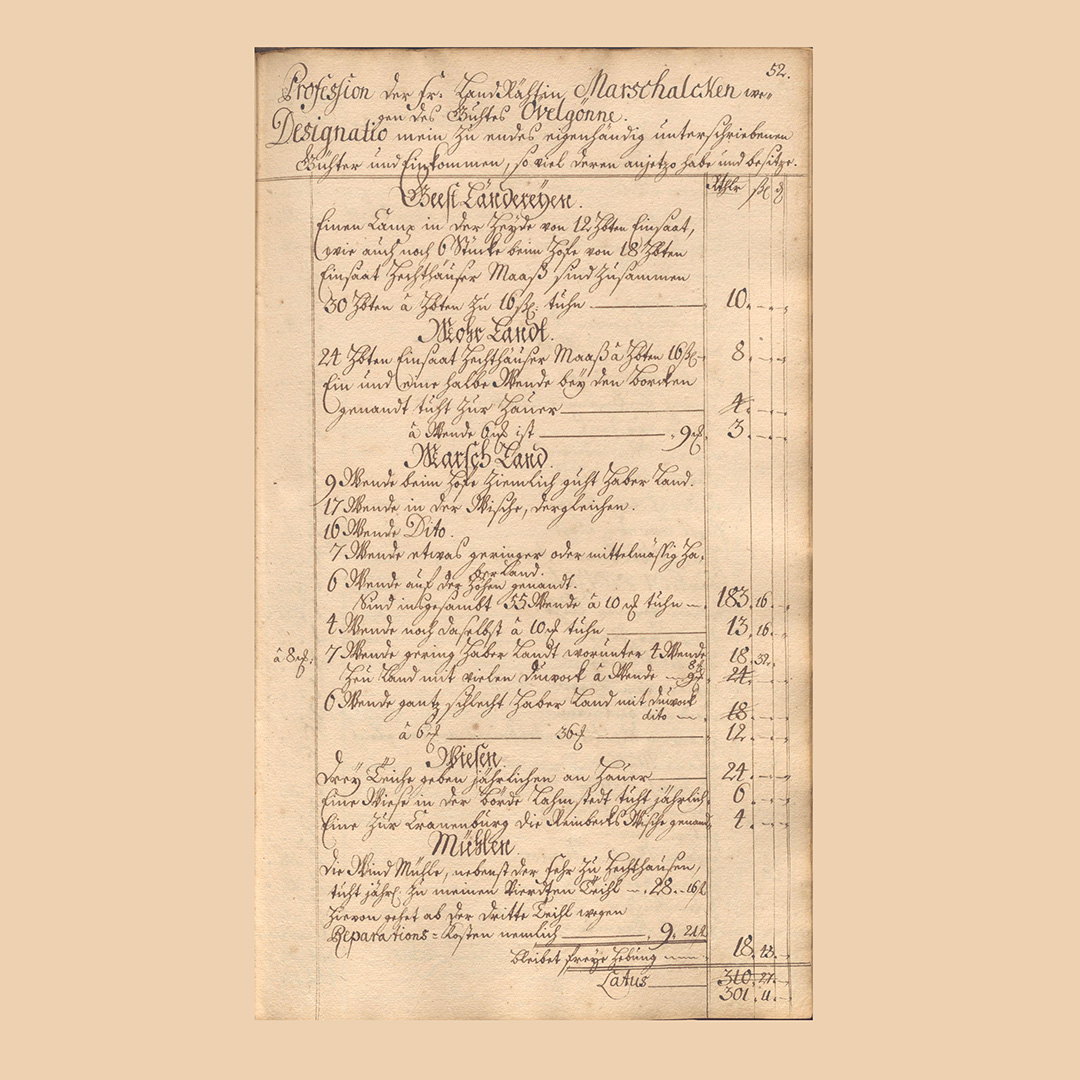 Als nächstes werden die Meier- und Kathstellen aufgeführt. Zwar werden die Meier nicht alle namentlich genannt, aber summarisch in den einzelnen Ortschaften aufgeführt und welchen Ertrag sie für die Gutsherrschaft bringen. Dabei erstaunt, wie weit entfernt die Meierstellen teils vom eigentlichen Gutshof liegen. Ggf. werden Angaben zu Beteiligungen oder Besitz von Mühlen und Fähren gemacht. Nicht zu vergessen sind eventuelle Einnahmen aus der Forstwirtschaft und Bruchstrafen. Schließlich werden in Abzug gebracht etwaige Lasten, wie zum Beispiel für Deich- und Sielbau.