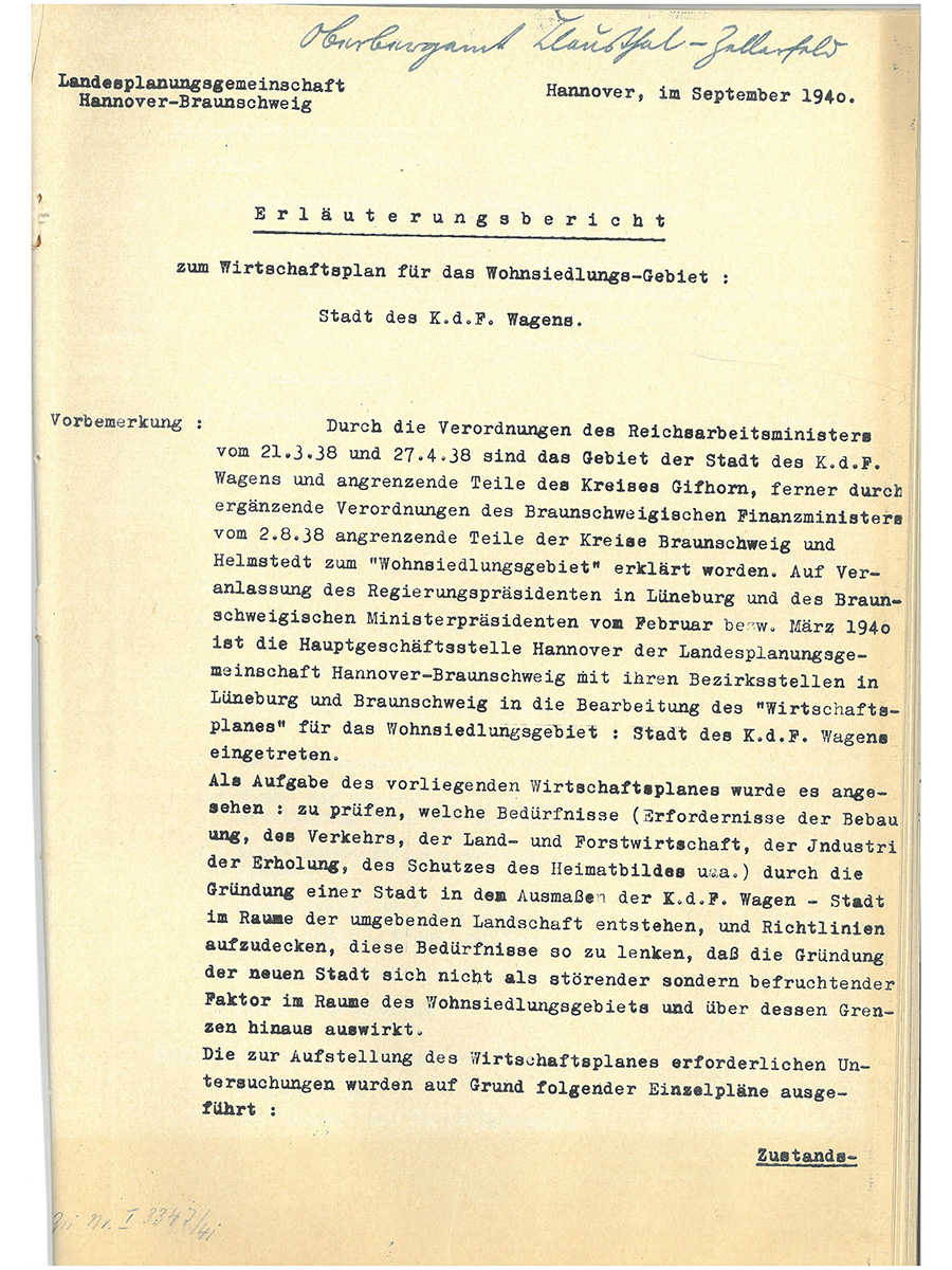 Im Zuge der weiteren städtebaulichen Maßnahmen im Gebiet der Volkswagenstadt legt der weitere Schriftverkehr mit dem OBA nahe, dass die Behörde auch in den Folgejahren über die laufenden Planvorhaben in Kenntnis gesetzt wurde, wie u.a. der von der Landesplanungsgemeinschaft Hannover-Braunschweig übersandte Erläuterungsbericht zum Wirtschaftsplan für das Wohnsiedlungsgebiet Stadt des KdF-Wagens vom 15. April 1941 zeigt.