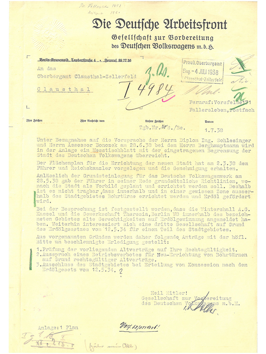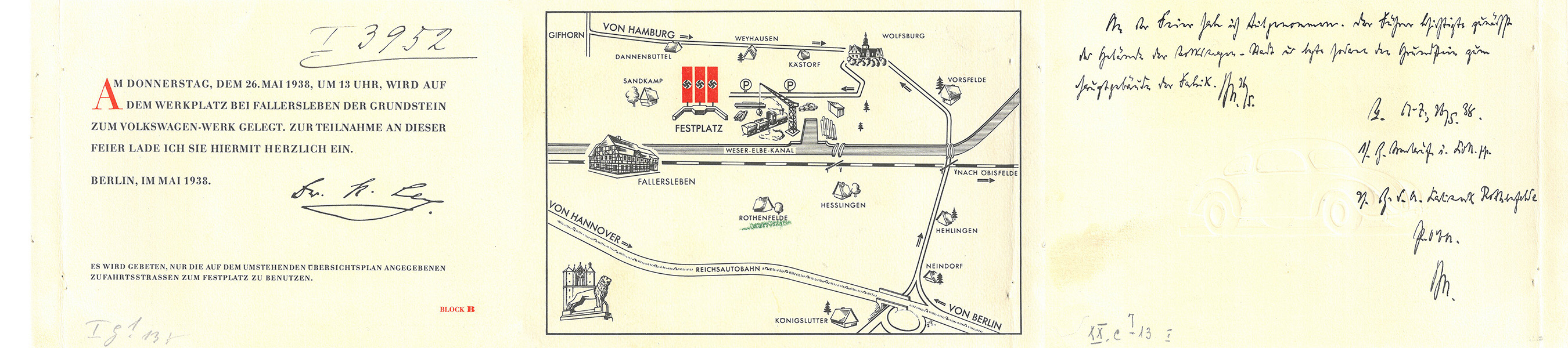 Die Grundsteinlegung für das Volkswagenwerk, fand schließlich am 26. Mai 1938 um 13 Uhr auf dem Werksplatz nördlich des Mittellandkanals statt, wie die in einer Akte des Oberbergamts Clausthal (OBA) überlieferte Einladungskarte nebst Anfahrtsskizze nahelegt. Die große Bedeutung des neuen Werks wurde, wie der Hannoversche Kurier vom 26. Mai 1938 hervorhebt, auch durch die Anwesenheit von Adolf Hitler unterstrichen, der in seiner Rede vor Ort auch grundsätzliche Richtlinien vorgab, wonach die Stadt als Vorbild geplant und errichtet werden sollte. Am 1. Juli 1938 folgte dann durch die Verordnung des Oberpräsidenten der Provinz Hannover die Bildung der „Stadt des KdF-Wagens bei Fallersleben“.