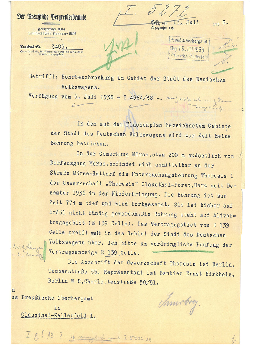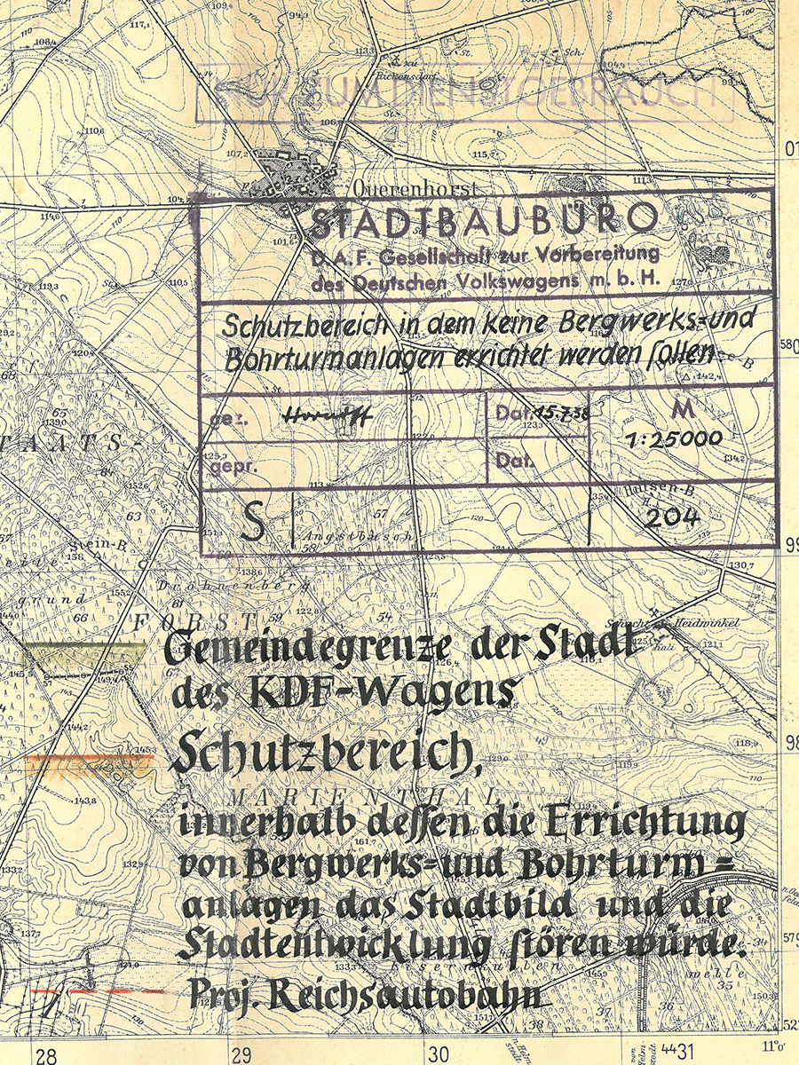Damit einhergehend wurde das OBA beauftragt die bergrechtlichen Verhältnisse der Planstadt zu prüfen und Bohrbeschränkungen im Gebiet der Stadt umzusetzen, da es laut GeZuVor nicht tragbar sei, dass innerhalb und in einer gewissen Zone außerhalb des Stadtgebietes Bohrtürme errichtet werden und Erdöl gefördert wird. Der nachfolgende Schriftverkehr mit dem OBA enthält so u.a. auch Flächenpläne mit Angabe der „Wolfsburger“ Gemeindegrenzen für einen Schutzbereich in welchem keine Bergwerks- und Bohrturmanlagen errichtet werden sollten.