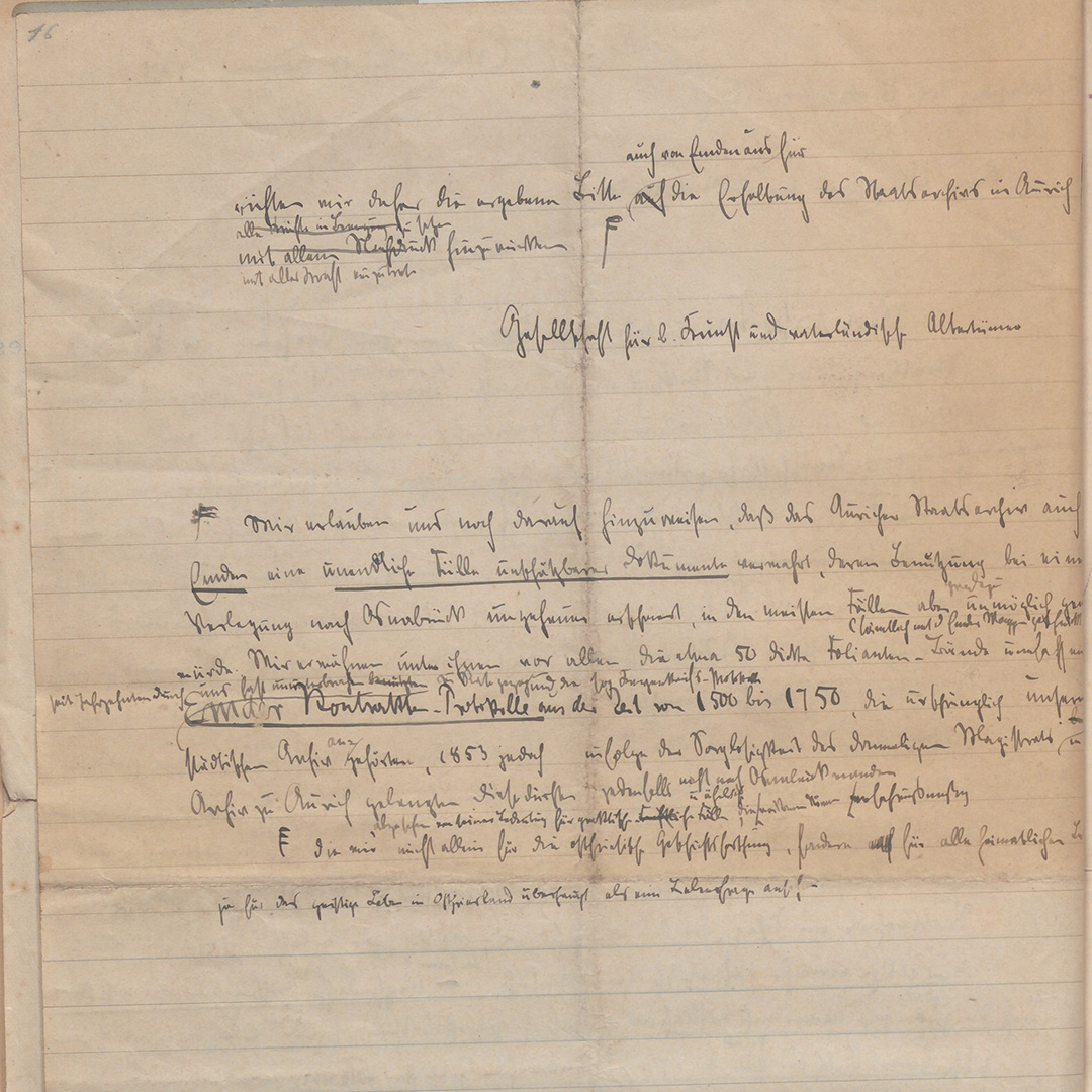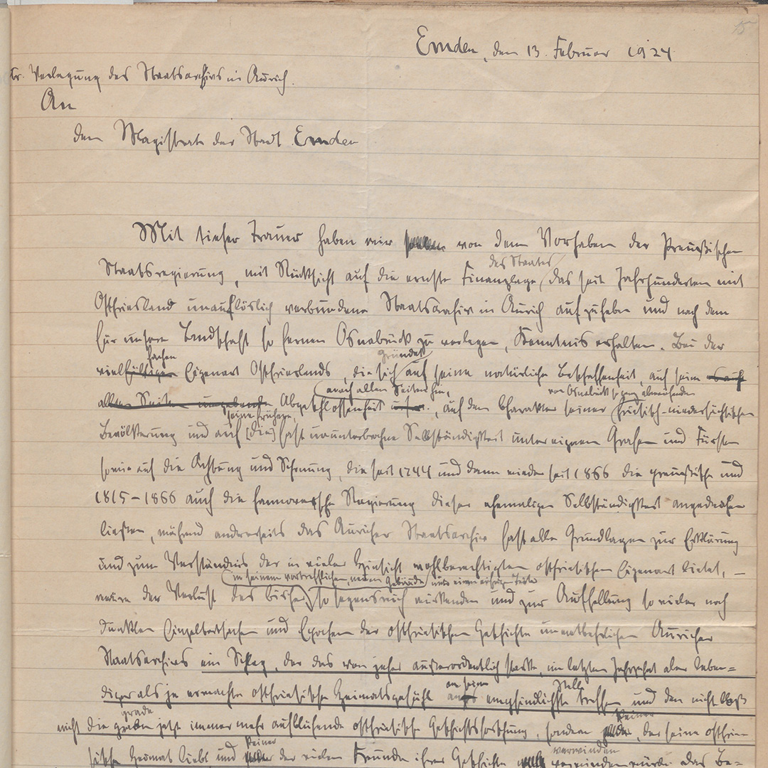 Mit den Worten „Mit tiefer Trauer“ beginnt ein Schreiben der Gesellschaft für bildende Kunst und vaterländische Altertümer an den Magistrat der Stadt Emden vom 13. Februar 1924, in dem auf die drohende Schließung des Staatsarchivs Aurich reagiert wurde. Dahinter standen Erwägungen der preußischen Staatsregierung, angesichts der überaus angespannten Finanzlage die „Zusammenlegung von Behörden“ zu prüfen, um Einsparungen zu erzielen. Dies erschien beim Staatsarchiv in Aurich realisierbar, das mit dem Osnabrücker Staatsarchiv vereinigt werden sollte.