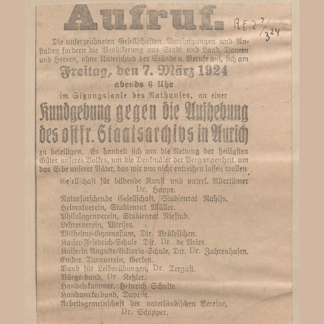 Bemerkenswert ist das Schreiben, weil die 1820 gegründete Gesellschaft für bildende Kunst und vaterländische Altertümer, kurz die „Kunst“ genannt, das 1872 gegründete Staatsarchiv in Aurich bislang eher als Konkurrenz betrachtet hatte. Doch der Vorstoß der preußischen Staatsregierung führte nun dazu, dass sich gerade die „Kunst“ für die Erhaltung des Archivs einsetzte und sich sogar an die Spitze einer „Kundgebung gegen die Aufhebung des ostfriesischen Staatsarchivs in Aurich“ in Emden am 7. März 1924 stellte.