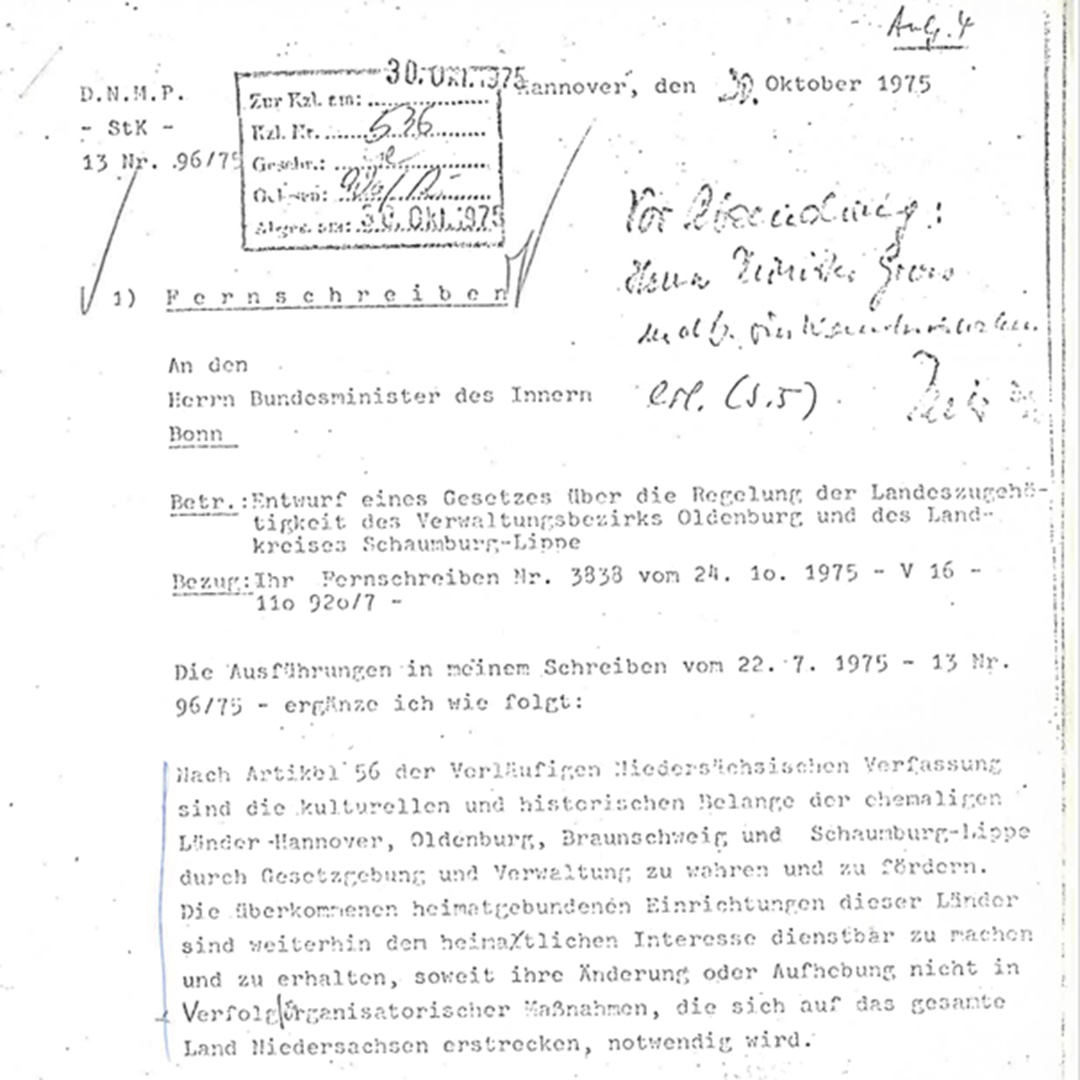 Am 30. Oktober 1975 richtete die Niedersächsische Staatskanzlei ein mehrseitiges Fernschreiben an den Bundesminister des Innern zur Fassung eines „Gesetzes über die Regelung der Landeszugehörigkeit des Verwaltungsbezirks Oldenburg und des Landkreises Schaumburg-Lippe“. Warum musste die Landeszugehörigkeit der beiden Gebiete geregelt werden? Am 19. Januar 1975 waren im Verwaltungsbezirk Oldenburg und im Landkreis Schaumburg-Lippe so erfolgreiche Volksentscheide zugunsten der Bildung jeweils selbständiger Länder durchgeführt worden, dass nach Art. 29 des Grundgesetzes die Landeszugehörigkeit dieser beiden Gebietsteile Niedersachsens bundesgesetzlich zu regeln war. Die Bundesregierung setzte sich für das Verbleiben beider Gebiete beim Land Niedersachsen ein, um sicherzustellen, dass „die Länder nach Größe und Leistungsfähigkeit die ihnen obliegenden Aufgaben wirksam erfüllen können". Doch wie stand es um den Umgang mit der in Art. 29 GG ebenfalls erhobenen Anforderung zur Berücksichtigung „landsmannschaftlicher Verbundenheit“ und „geschichtlicher und kultureller Zusammenhänge“? Dies war nun Ländersache: Die Niedersächsische Staatskanzlei verwies auf Art. 56 der Vorläufigen Niedersächsischen Verfassung, der schließlich die Wahrung kultureller und historischer Belange der ehemaligen Länder Hannover, Oldenburg, Braunschweig und Schaumburg-Lippe für die Gesetzgebung und Verwaltung vorschriebe.