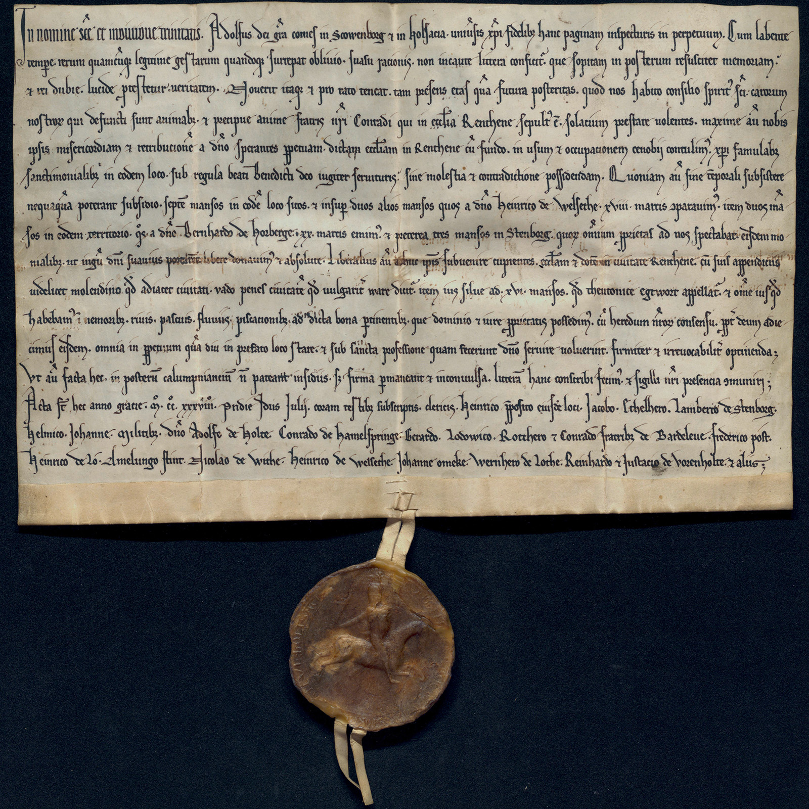 Adolf IV. zu Holstein-Schaumburg übergibt dem Kloster Rinteln die dortige Kirche mit umfangreichem Besitz, 14. Juli 1238 (NLA BU Orig. F Nr. 42)