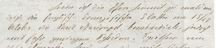 habe ich die Ehre hiermit zu melden, daß eine Englisch-Französische Flotte am 15/27 Oktober [julianischer/gregorianischer Kalender] die Stadt Marioupol bombardierte, jedoch mit sehr geringem Schaden. Späther am 22/3 November forderte die nähmliche Flotte eine Erklärung, daß alle in Marioupol liegende Weitzen ausländisches Eigenthum sind, erhielt ein solches Document, und entfernte sich.