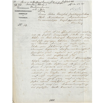 Bericht des oldenburgischen Konsuls in Taganrog vom 11. November 1855 über Handelsschifffahrt im Asowschen Meer während des Krimkrieges (NLA OL Best. 70 Nr. 7164-2)