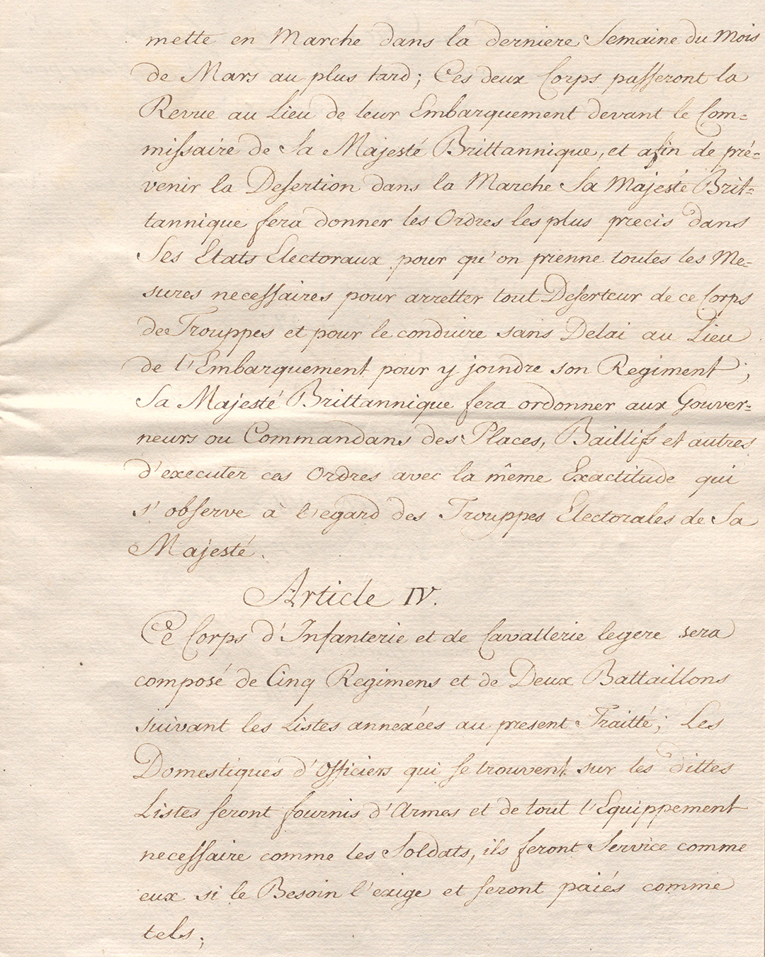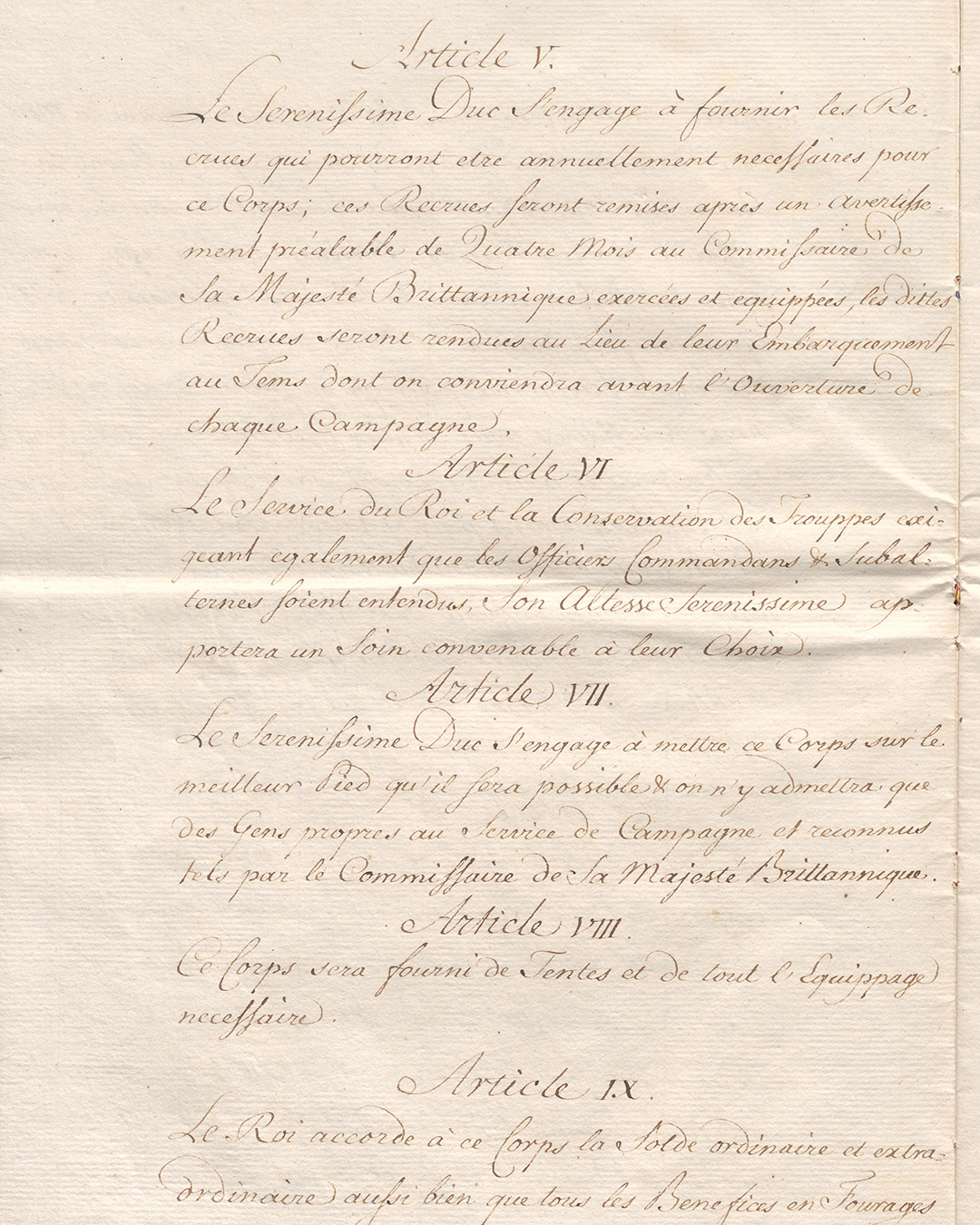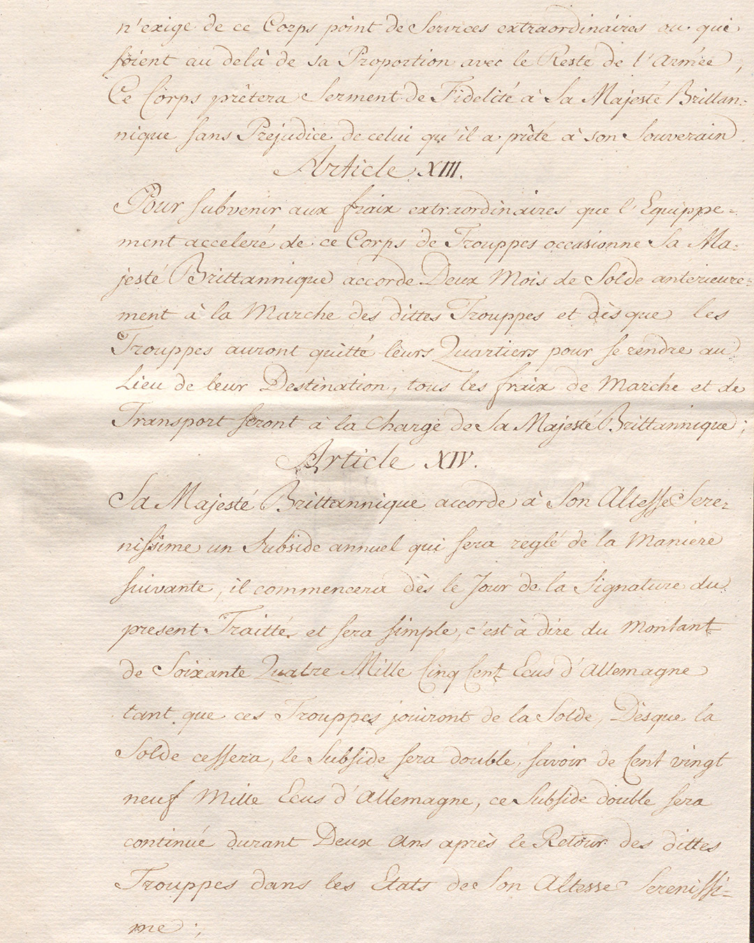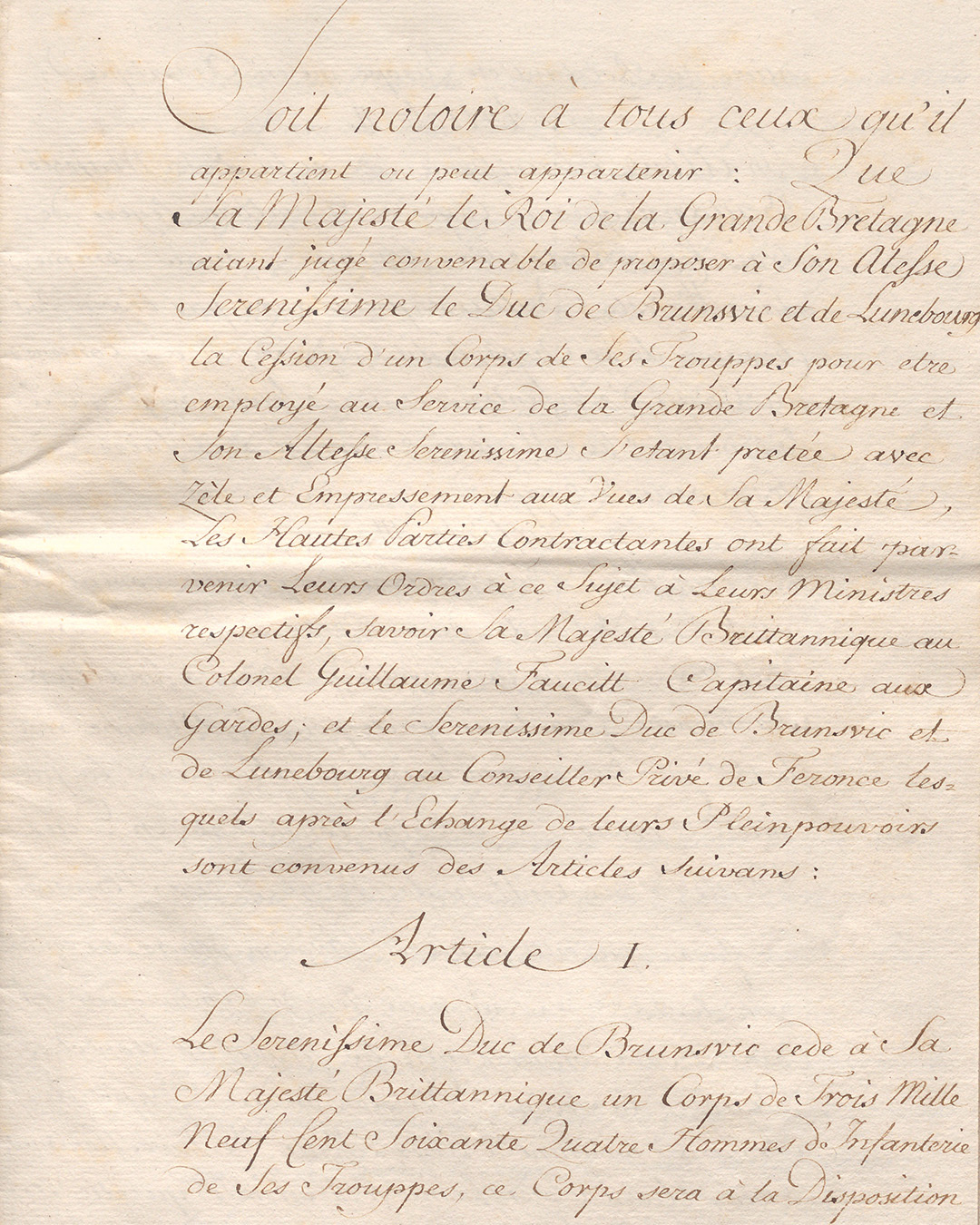 Im abgebildeten Vertrag legten beide Seiten die Konditionen für die Vermietung der Truppen fest, vereinbarten deren Zahl, ihren Transport, ihre Ausrüstung und die Höhe der Subsidien. Folglich handelt es sich um das Kernstück dieses Geschäfts. Der Einsatz der Subsidientruppen blieb im kollektiven Gedächtnis der Braunschweiger haften und wurde im späten 19. und dem ersten Viertel des 20. Jahrhunderts zum politischen und wissenschaftlichen Streitobjekt. An der Frage, ob die Welfen ihre Landeskinder verkauft hatten, spalteten sich die politischen Lager, vor allem während des Herzogprozesses, den das Welfenhaus nach 1918 mit dem Freistaat Braunschweig führte.
