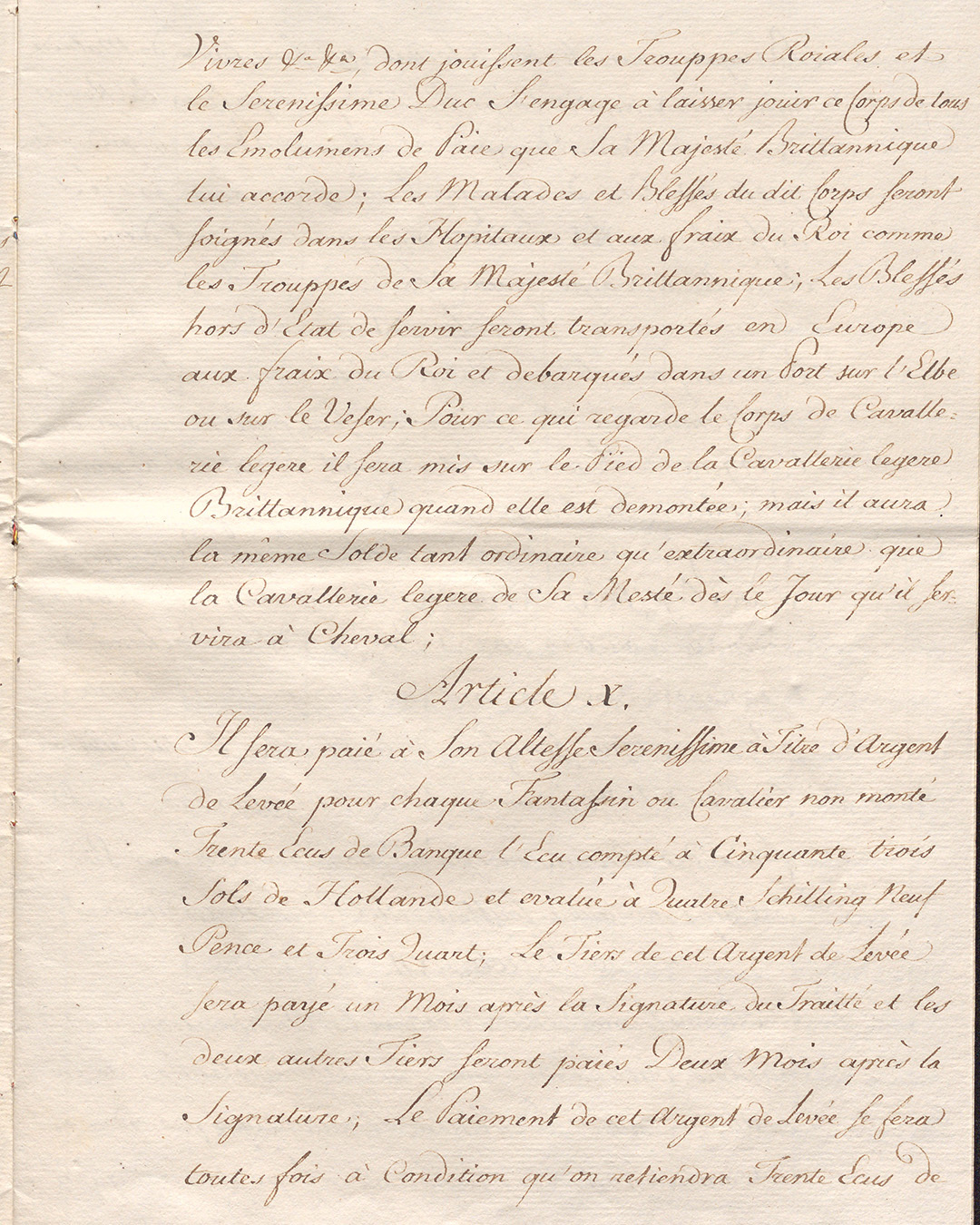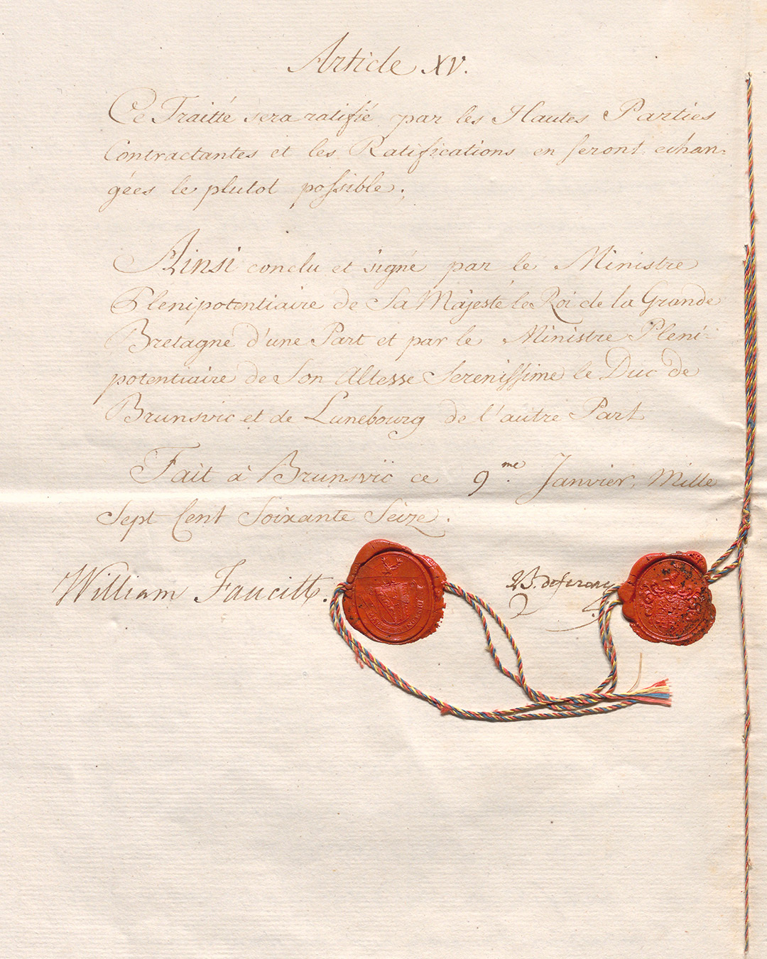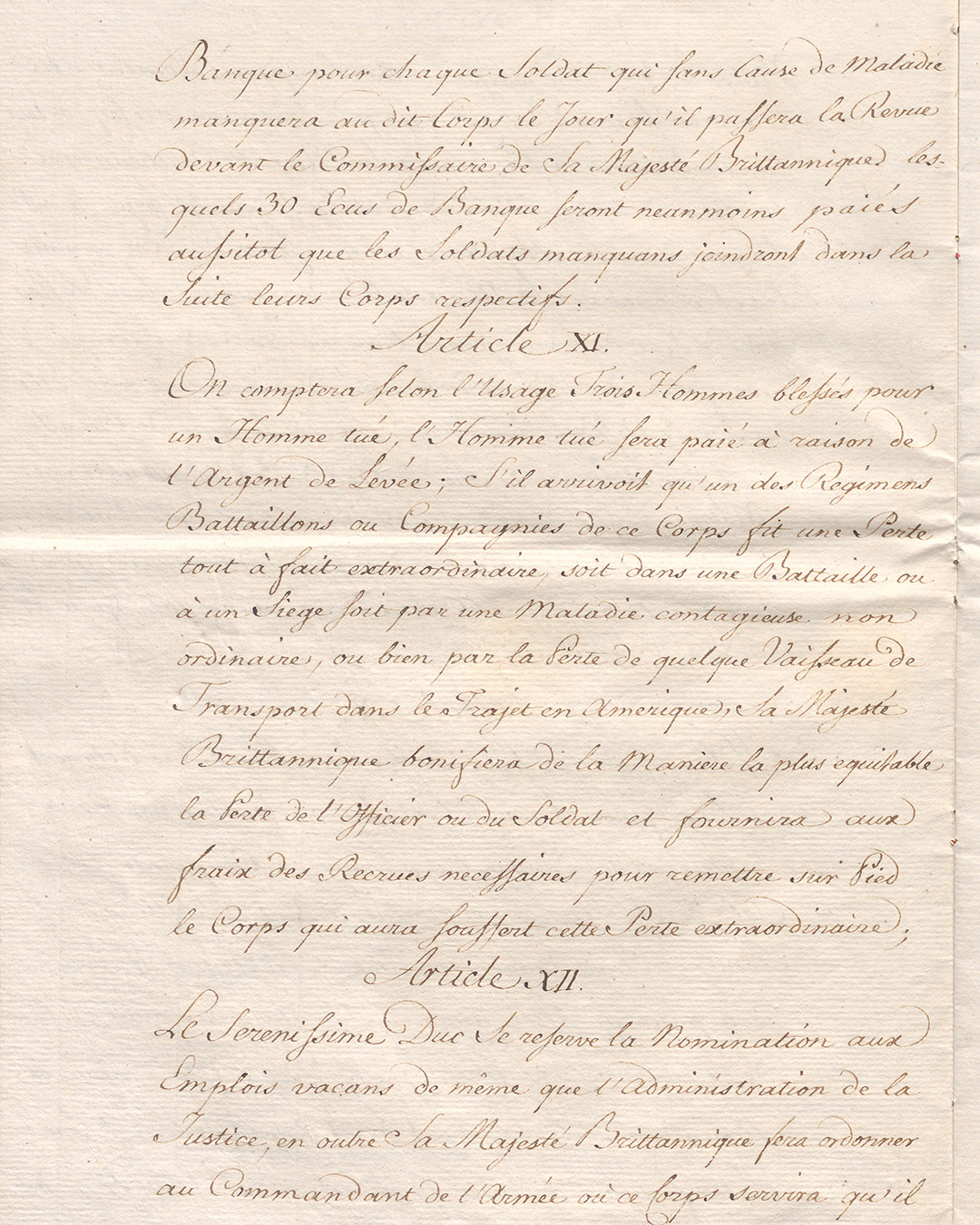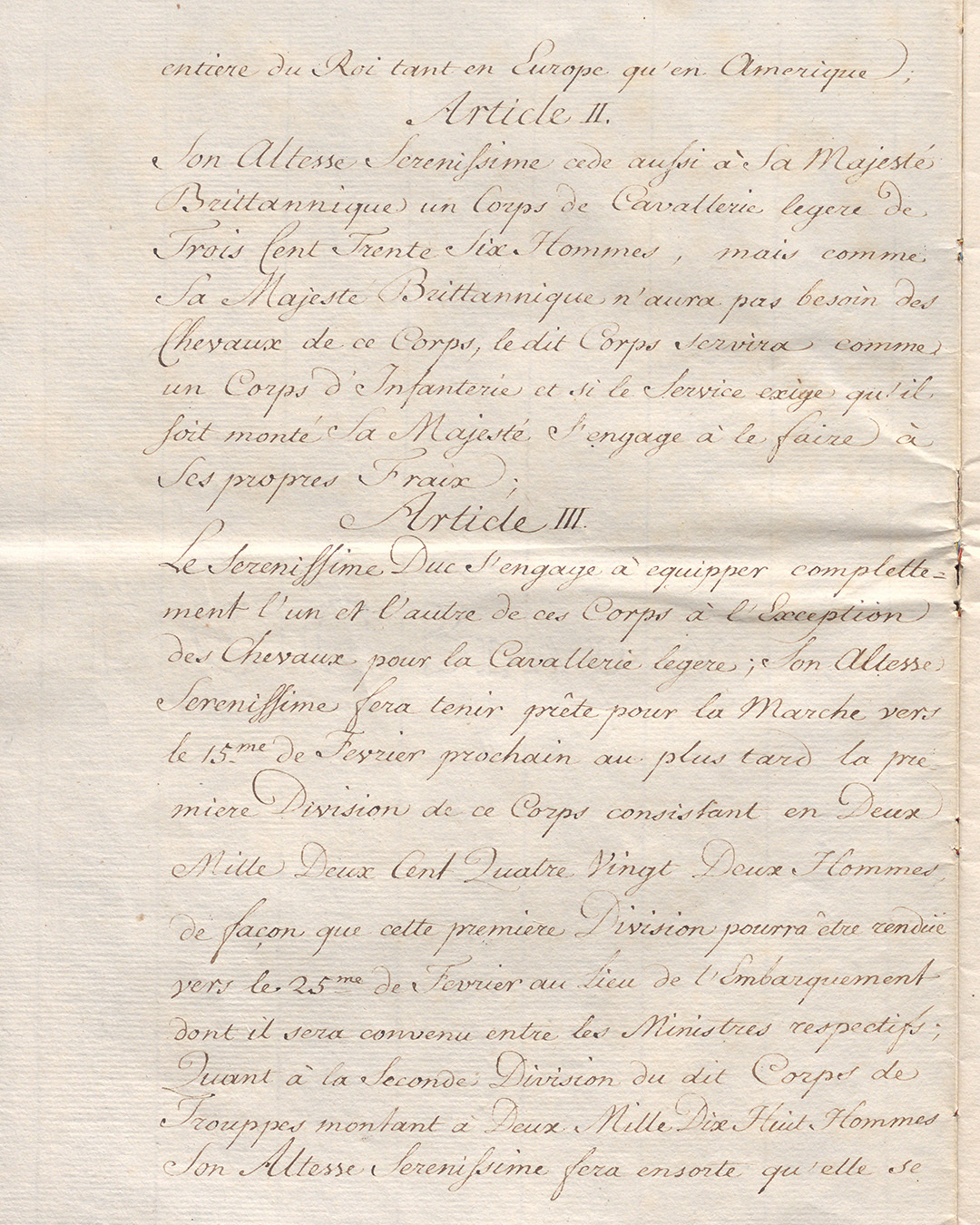 Im abgebildeten Vertrag legten beide Seiten die Konditionen für die Vermietung der Truppen fest, vereinbarten deren Zahl, ihren Transport, ihre Ausrüstung und die Höhe der Subsidien. Folglich handelt es sich um das Kernstück dieses Geschäfts. Der Einsatz der Subsidientruppen blieb im kollektiven Gedächtnis der Braunschweiger haften und wurde im späten 19. und dem ersten Viertel des 20. Jahrhunderts zum politischen und wissenschaftlichen Streitobjekt. An der Frage, ob die Welfen ihre Landeskinder verkauft hatten, spalteten sich die politischen Lager, vor allem während des Herzogprozesses, den das Welfenhaus nach 1918 mit dem Freistaat Braunschweig führte.